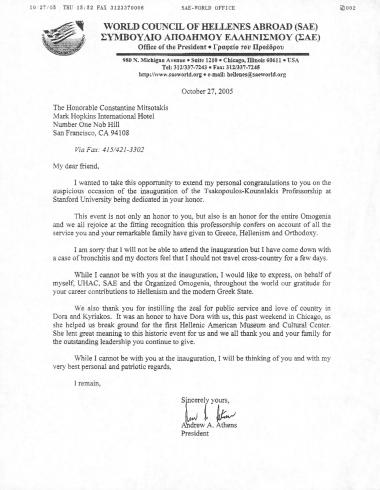 Επιστολή του Προέδρου του Συμβουλίου Απόδημου Ελληνισμιού (ΣΑΕ) προς ΚΜ σχετικά με την έδρα Κωνσταντίνος Μητσοτάκης στο Πανεπιστήμιο του Stanford