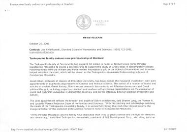 Ανακοίνωση σχετικά με με την ίδρυση έδρας ελληνικών σπουδών Κωνσταντίνος Μητσοτάκης στο Πανεπιστήμιο του Stanford