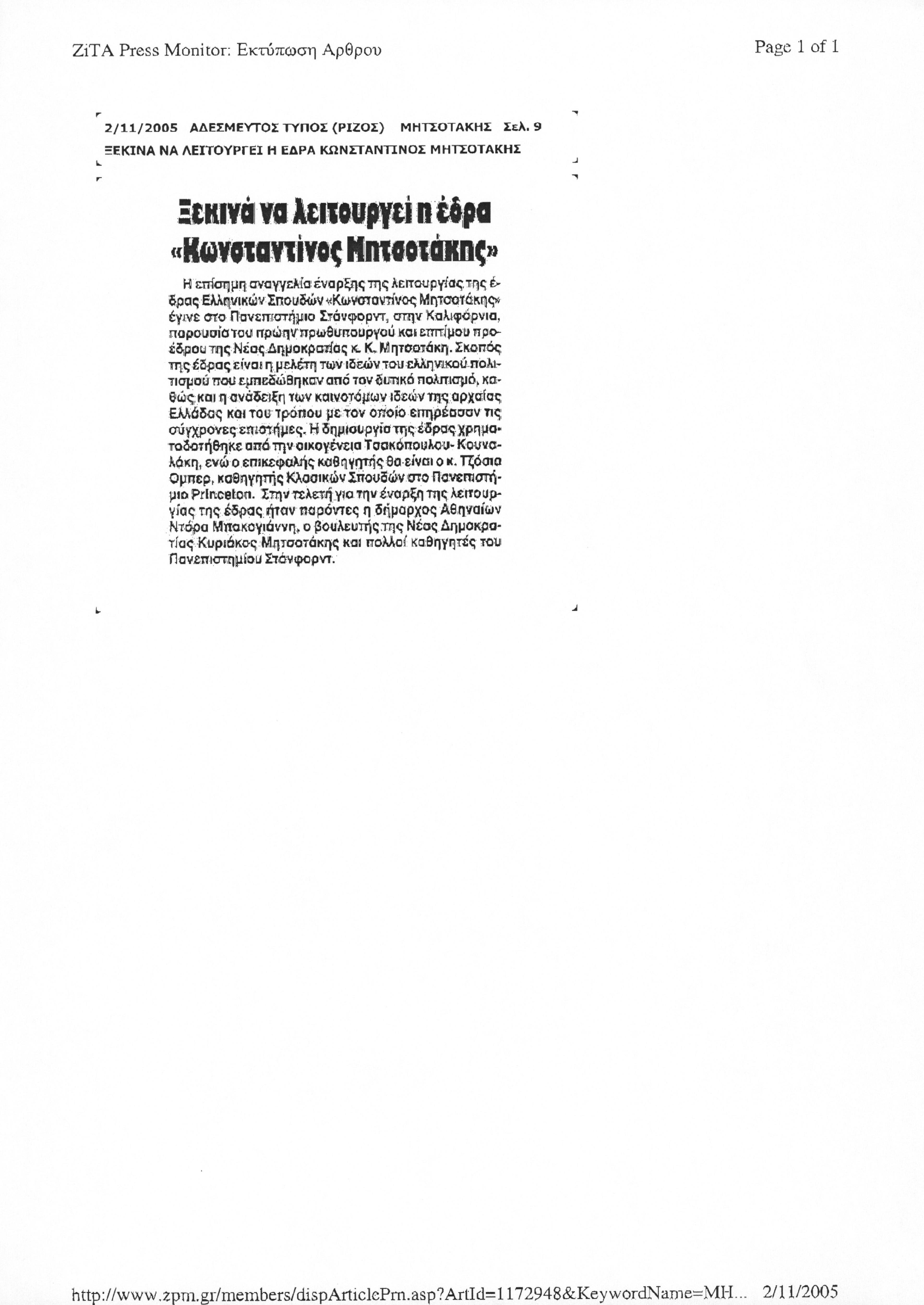 Δημοσίευμα της εφημερίδας Άδέσμευτος Τύπος (Ρίζος) σχετικά με με την ίδρυση έδρας ελληνικών σπουδών Κωνσταντίνος Μητσοτάκης στο Πανεπιστήμιο του Stanford