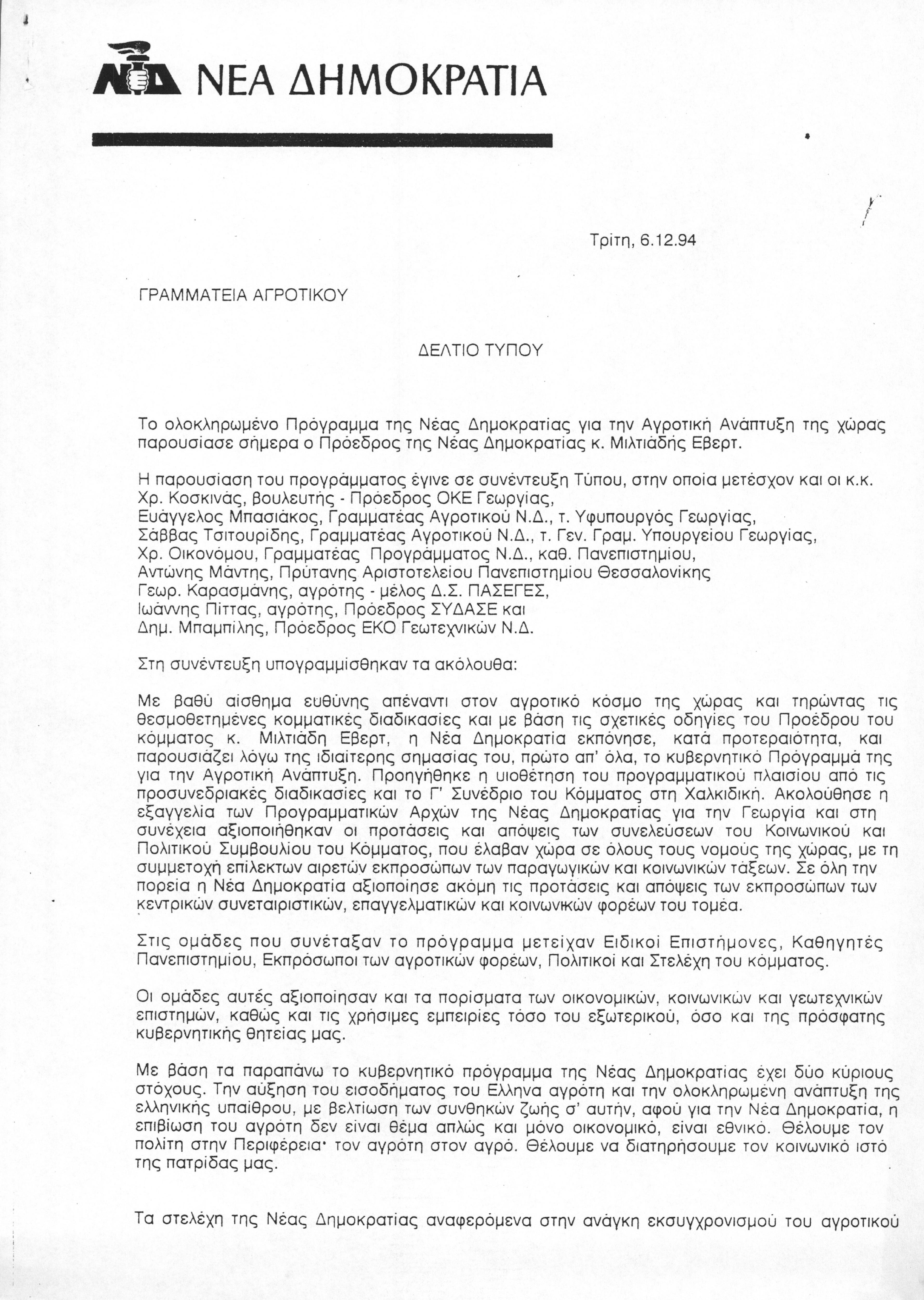Δελτίο τύπου Γραμματείας Αγροτικού ΝΔ σχετικά με το πρόγραμμα αγροτικής ανάπτυξης