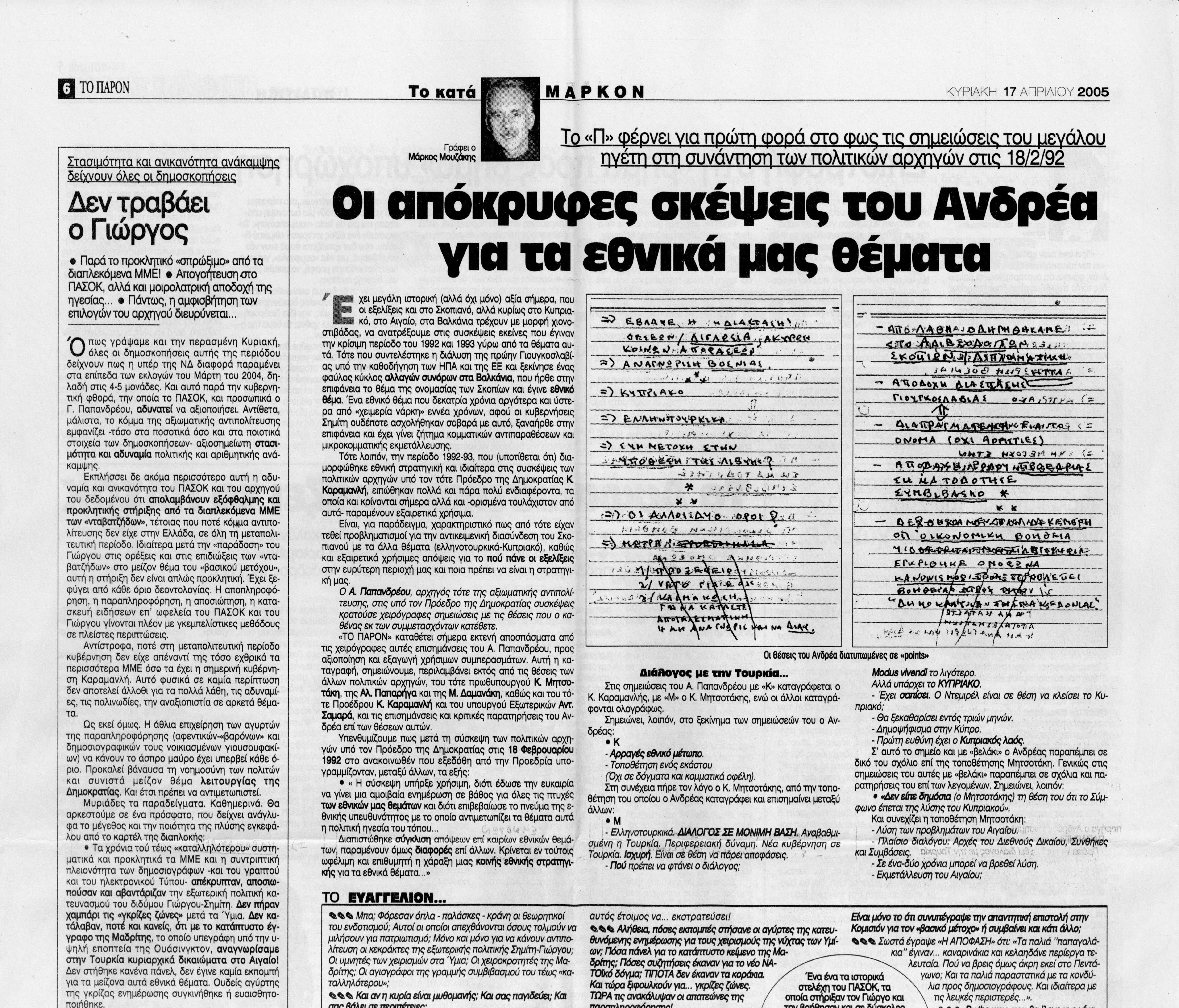 Δημοσίευμα της εφημερίδας Το Παρόν σχετικά με τις σημειώσεις του Ανδρέα Παπανδρέου στη συνάντηση των πολιτικών αρχηγών στις 18/02/1992