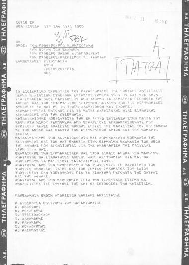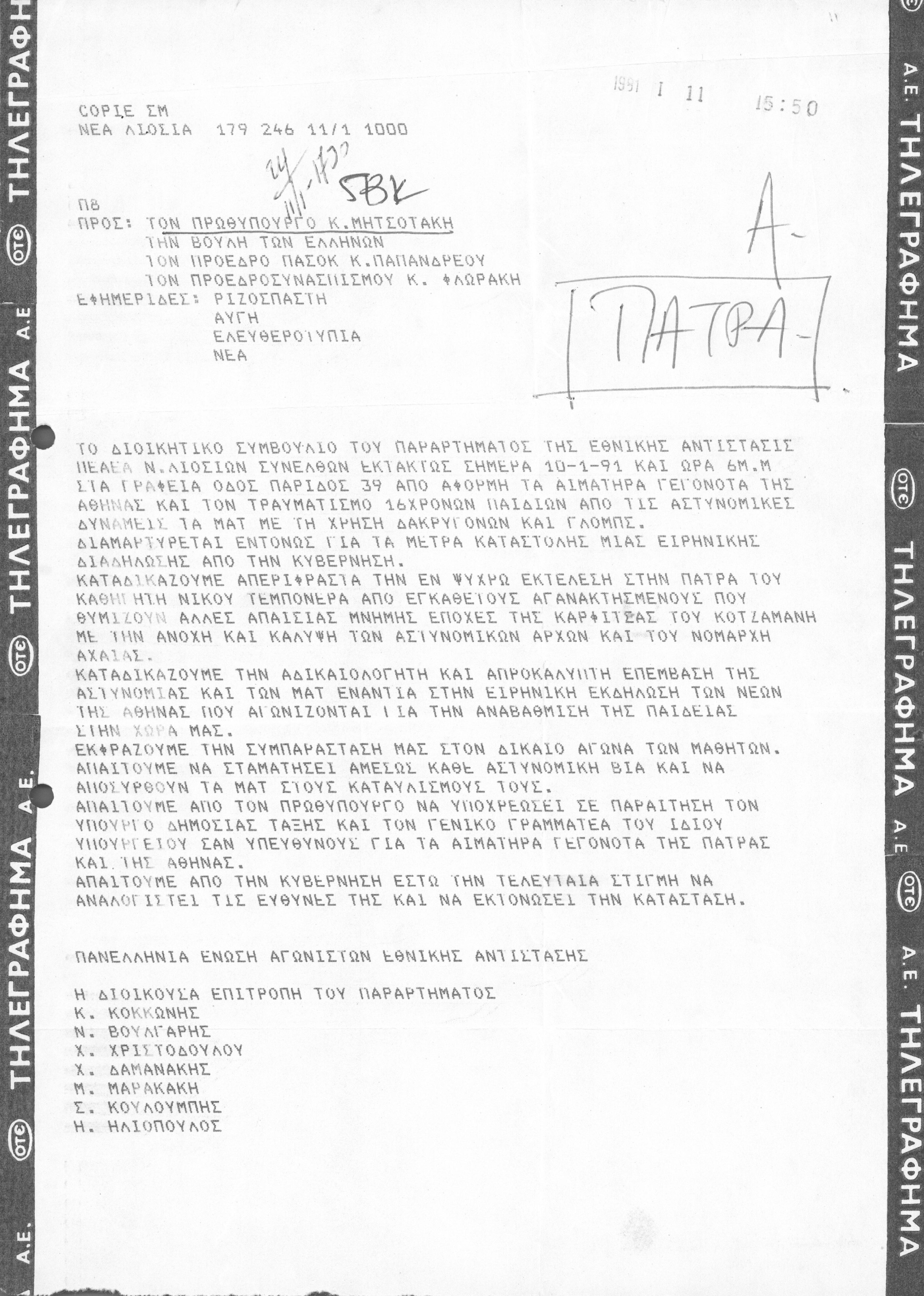Τηλεγράφημα Διοικητικού Συμβουλίου του παραρτήματος της Εθνικής Αντίστασης ΠΕΑΕΑ Ν. Λιοσίων σχετικά με τις εξελίξεις στο χώρο της παιδείας