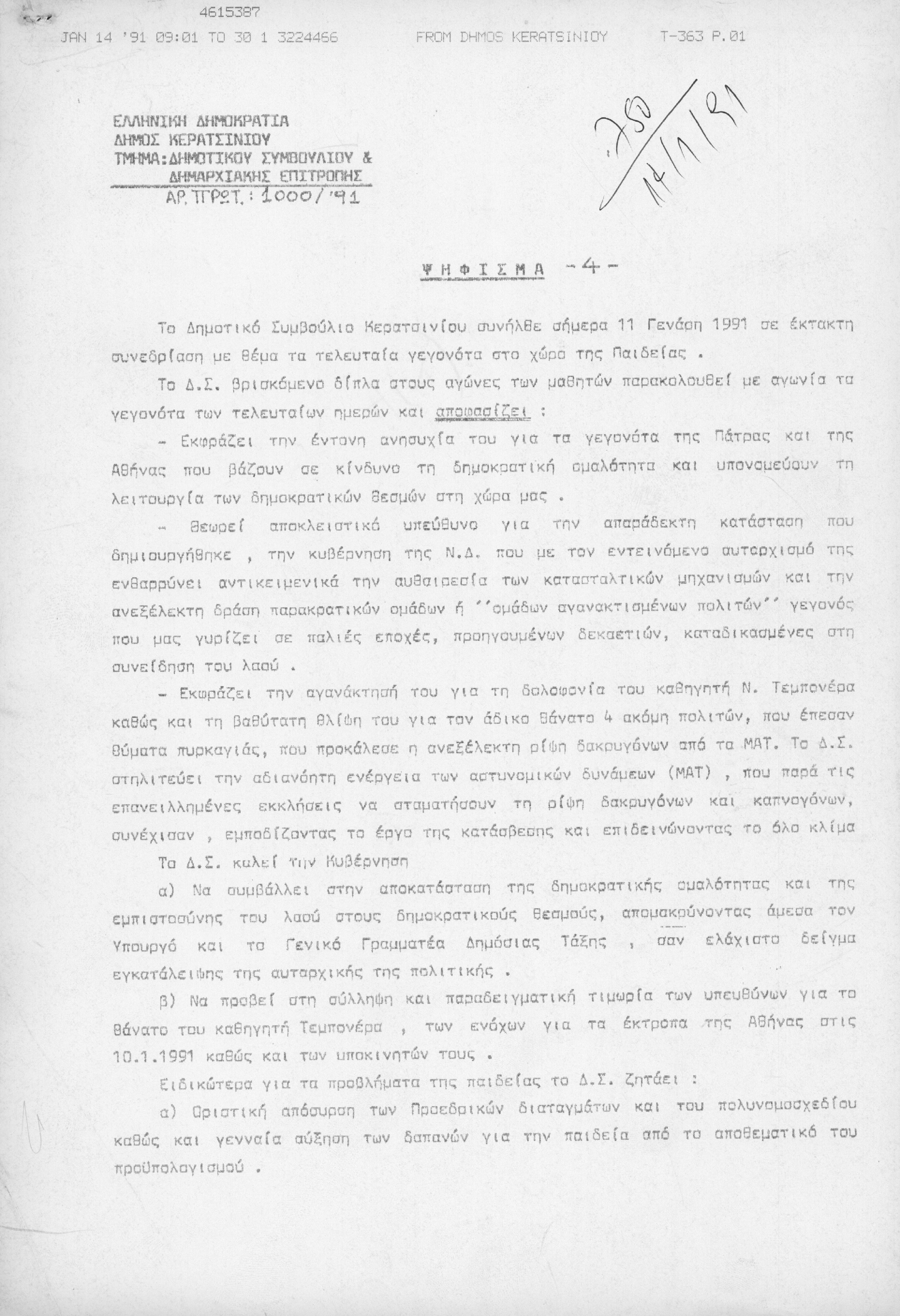 Ψήφισμα Δημοτικού Συμβουλίου Κερατσινίου σχετικά με τις εξελίξεις στο χώρο της παιδείας