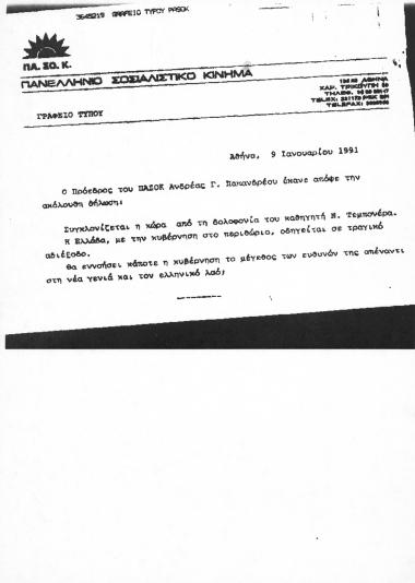 Δελτίο τύπου ΠΑΣΟΚ σχετικά με δήλωση του Ανδρέα Παπανδρέου για τη δολοφονία του Νίκου Τεμπονέρα