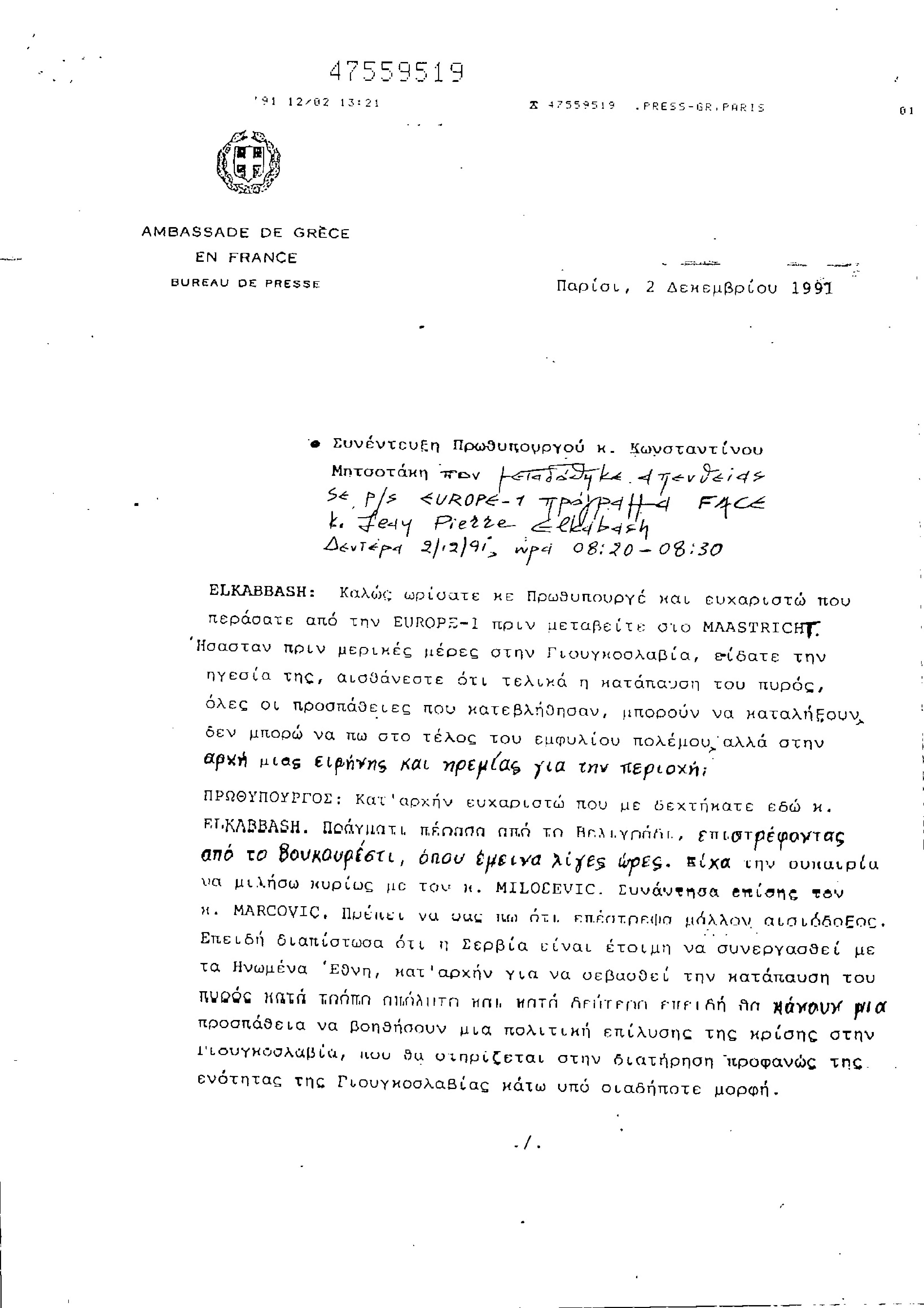 Απομαγνητοφώνηση Συνέντευξης Πρωθυπουργού κ. ΚΜ πριν την Συνθήκη του Maastricht σχετικά με τη Γιουγκοσλαβία και την Οικονομική του πολιτική