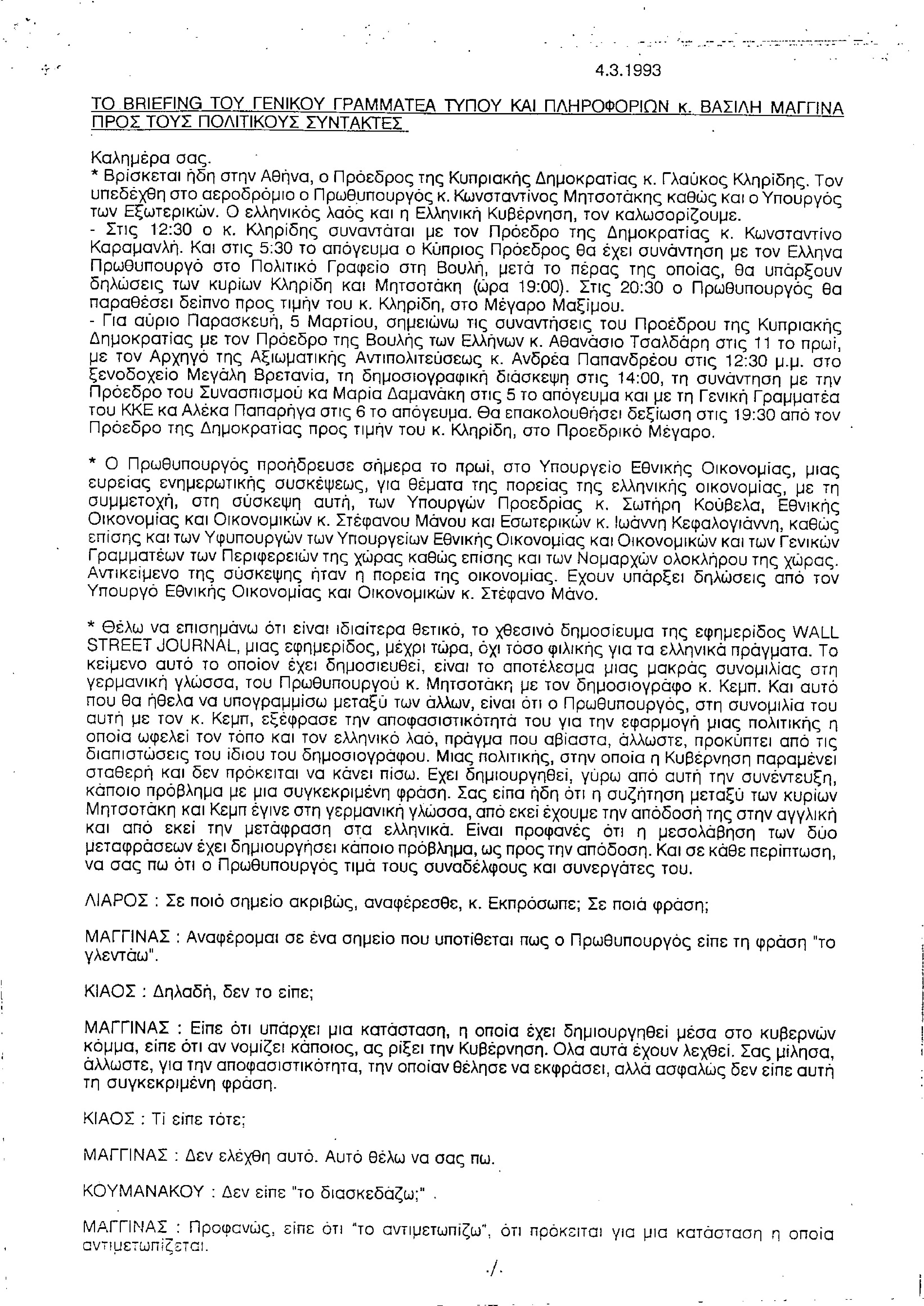 Briefing του Γενικού Γραμματέα Τύπου και Πληροφοριών κ. Βασίλη Μαγγίνα προς τους Πολιτικούς Συντάκτες σχετικά με την επίσκεψη του Προέδρου της Κυπριακής Δημοκρατίας κ. Γλαύκου Κληρίδη και την συνέντευξη του ΚΜ την εφημερίδα Wall Street Journal