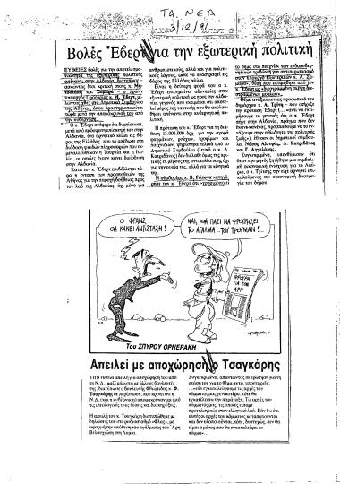 Δημοσιεύματα Εφημερίδας Τα Νέα σχετικά με τη θέση του κ. Μ. Έβερτ για την εξωτερική πολιτική απέναντι στην Αλβανία και για την πιθανή αποχώρηση του κ. Φ. Τσαγκάρη