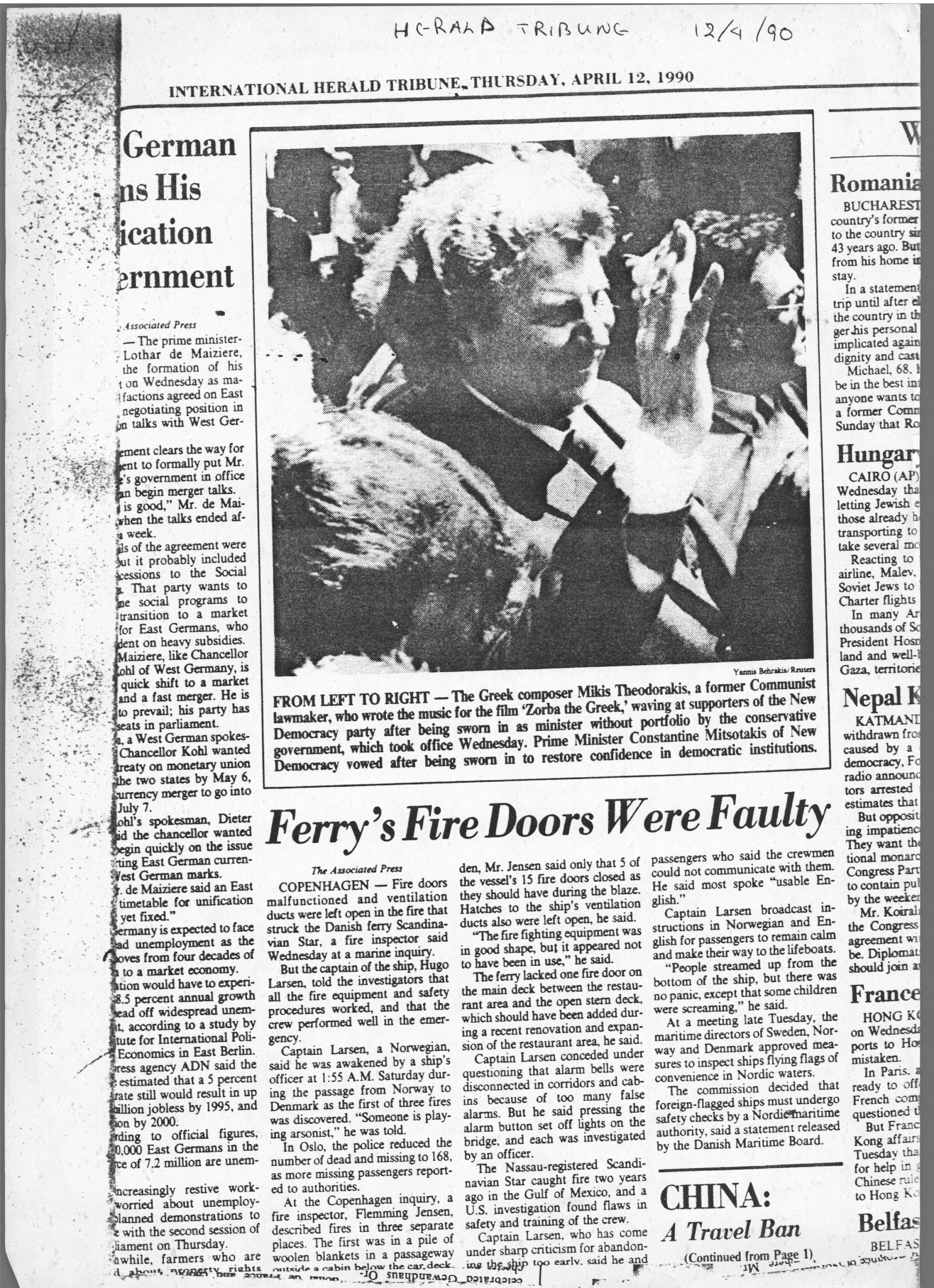 Δημοσίευμα Εφημερίδας International Herald Tribune σχετικά με τον κ. Μίκη Θεοδωράκη και τη θέση του υπουργού Επικρατείας