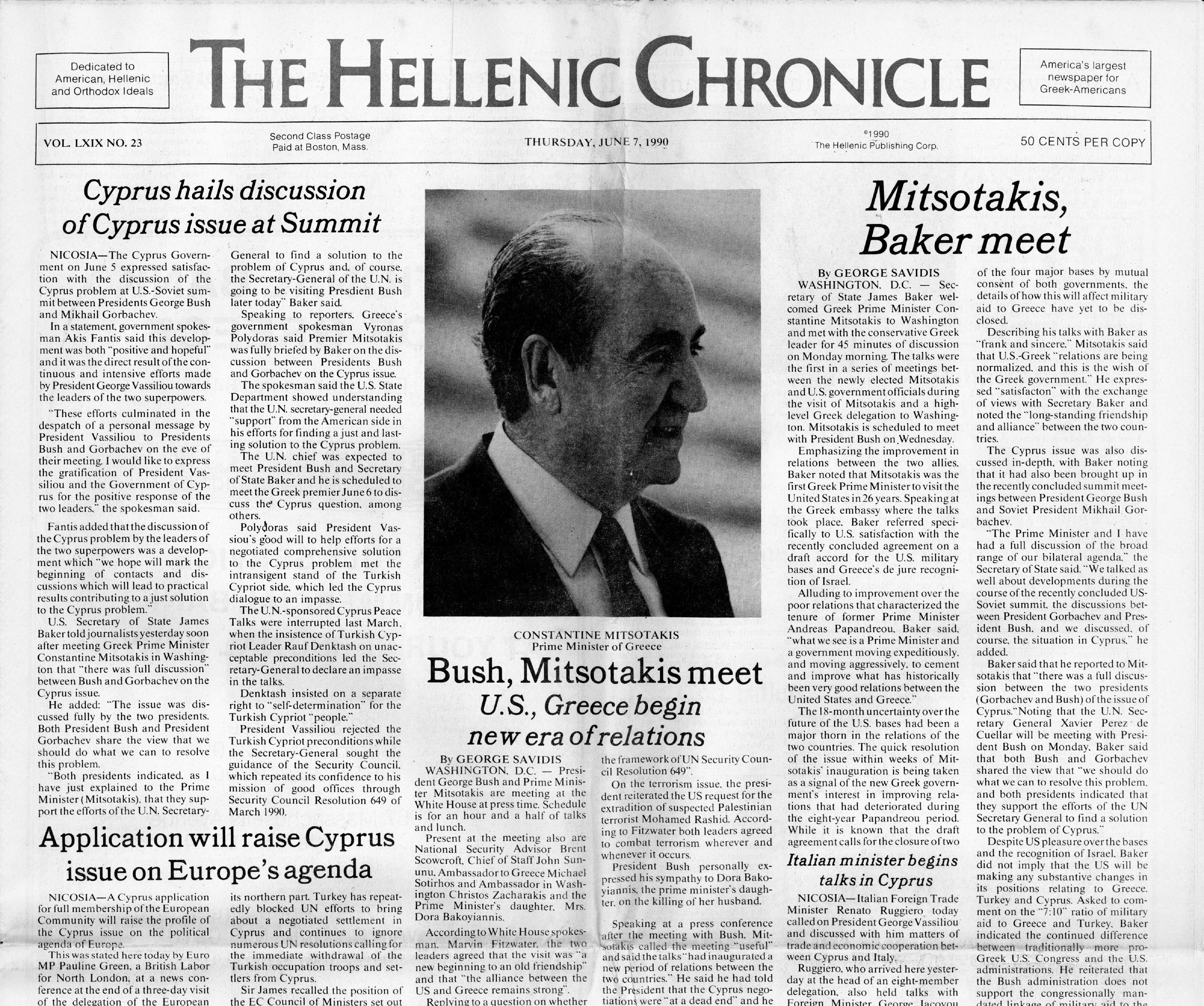 Δημοσίευμα της Εφημερίδας The Hellenic Chronicle σχετικά με τη συνάντηση του ΚΜ με τον James Baker Secretary of State και στη συνέχεια με τον Πρόεδρο των ΗΠΑ George Bush