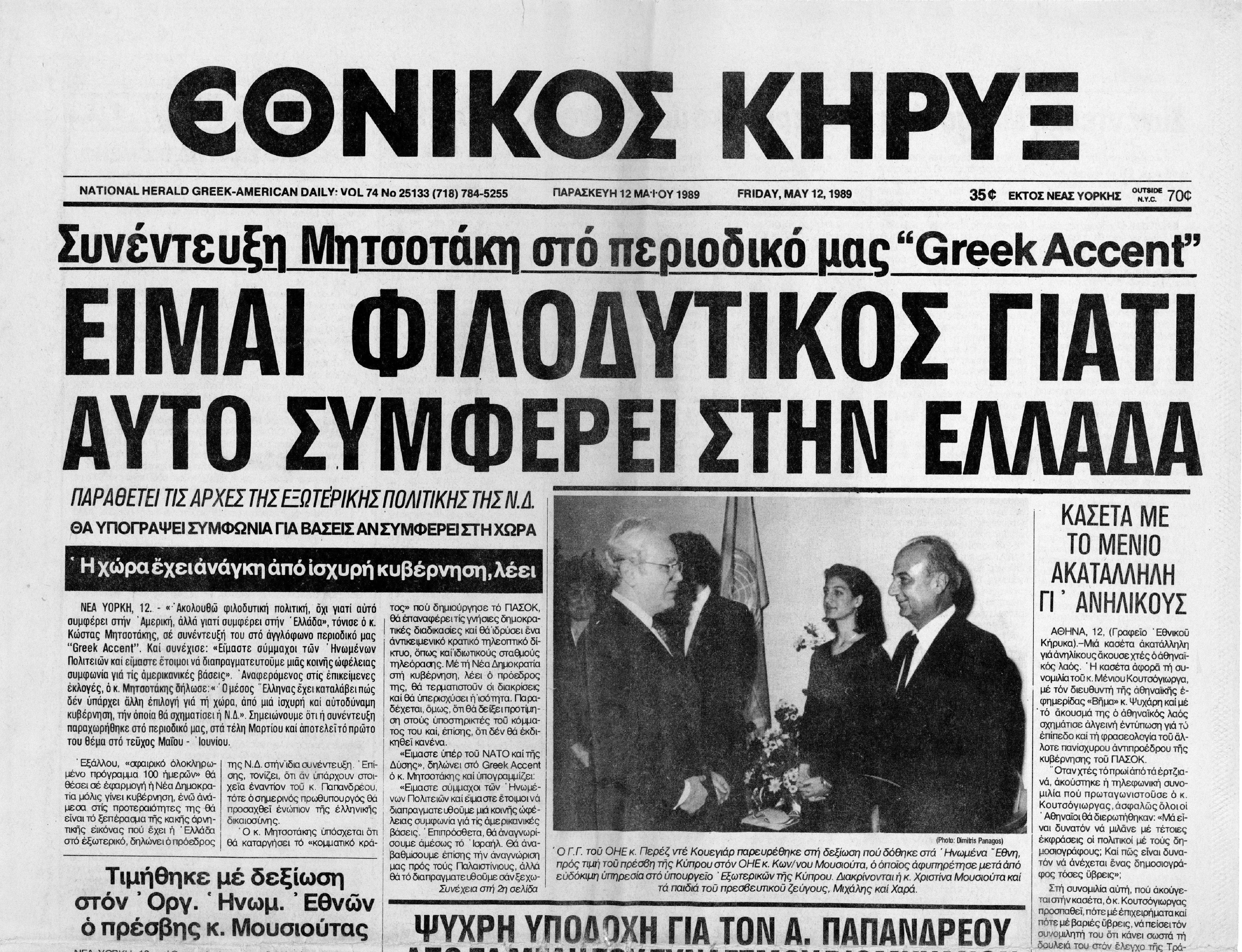 Δημοσίευμα της Εφημερίδας Εθνικός Κήρυξ σχετικά με τη συνέντευξη ΚΜ στο περιοδικό Greek Accent σχετικά με την εξωτερική πολιτική της Ν.Δ. και την πολιτική κατάσταση