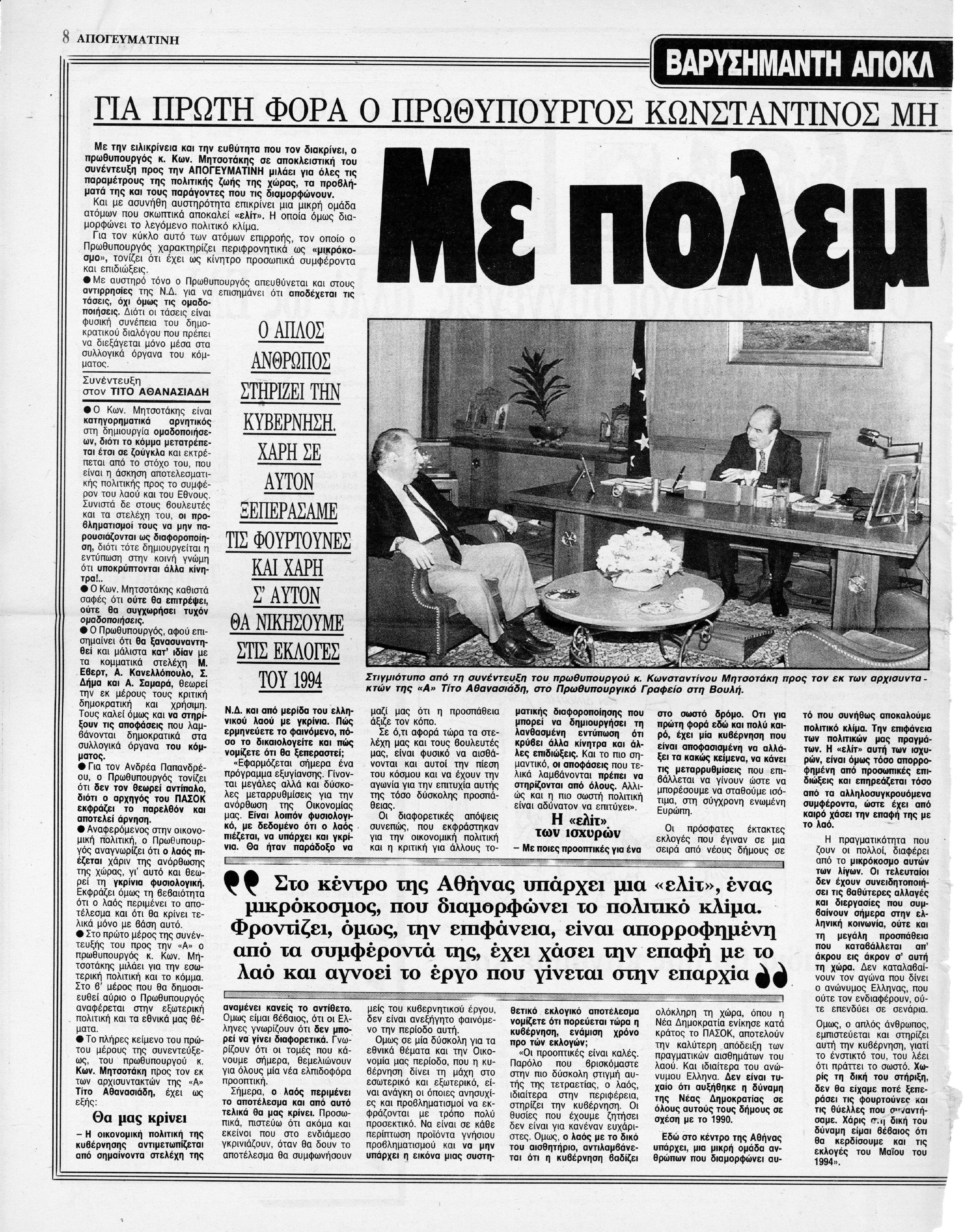 Συνέντευξη ΚΜ στην Εφημερίδα Απογευματινή σχετικά με εσωκομματικά θέματα ΝΔ, για το ΠΑΣΟΚ, για την εσωτερική και οικονομική πολιτική της κυβέρνησης