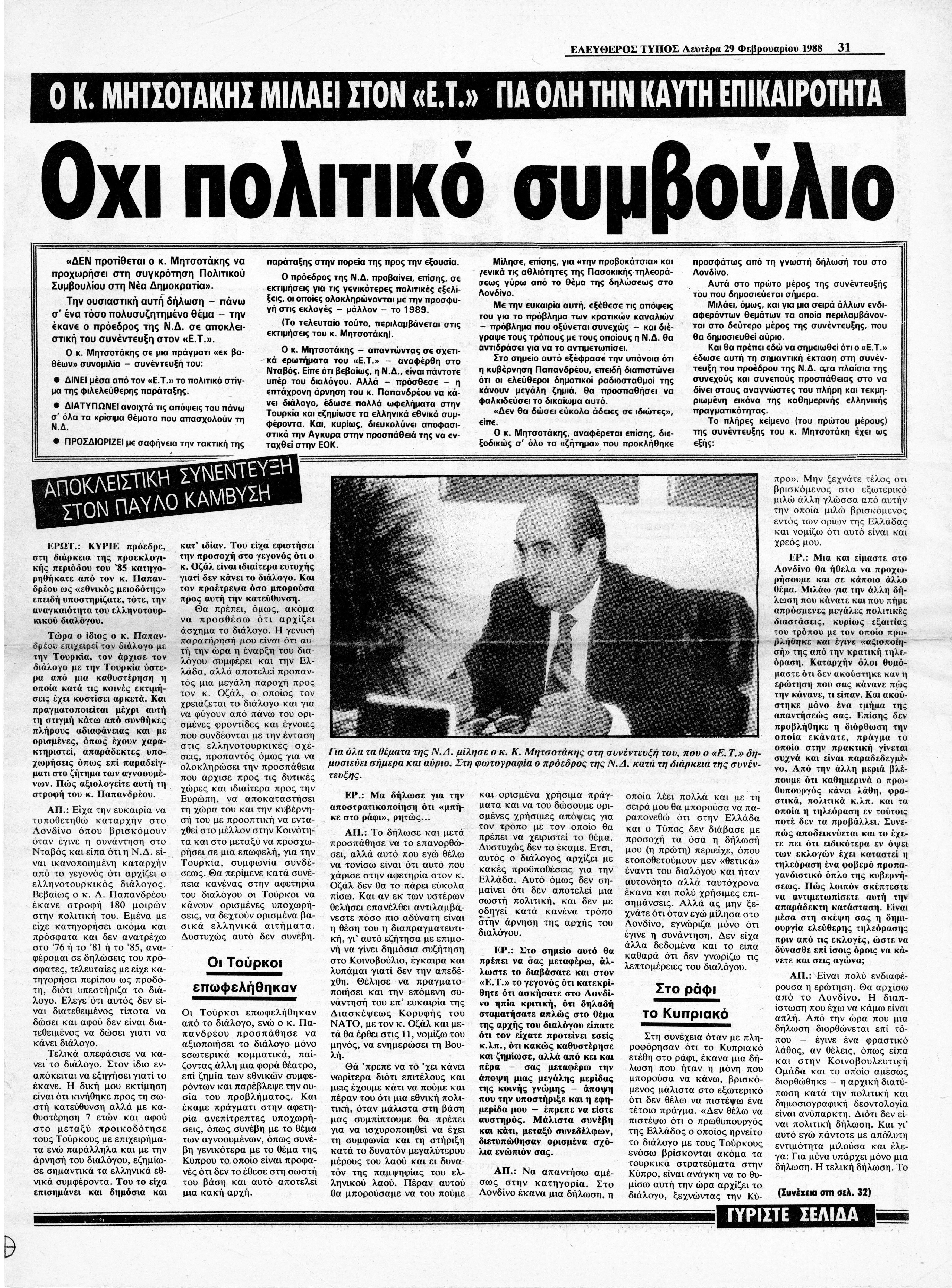Συνέντευξη ΚΜ στην Εφημερίδα Ελεύθερος Τύπος σχετικά με το ελληνοτουρκικό και το κυπριακό, τα εσωκομματικά θέματα ΝΔ και τη συνεδρίαση της κοινοβουλευτικής ομάδας, τα ΜΜΕ και την κριτική του για την κυβέρνηση ΠΑΣΟΚ