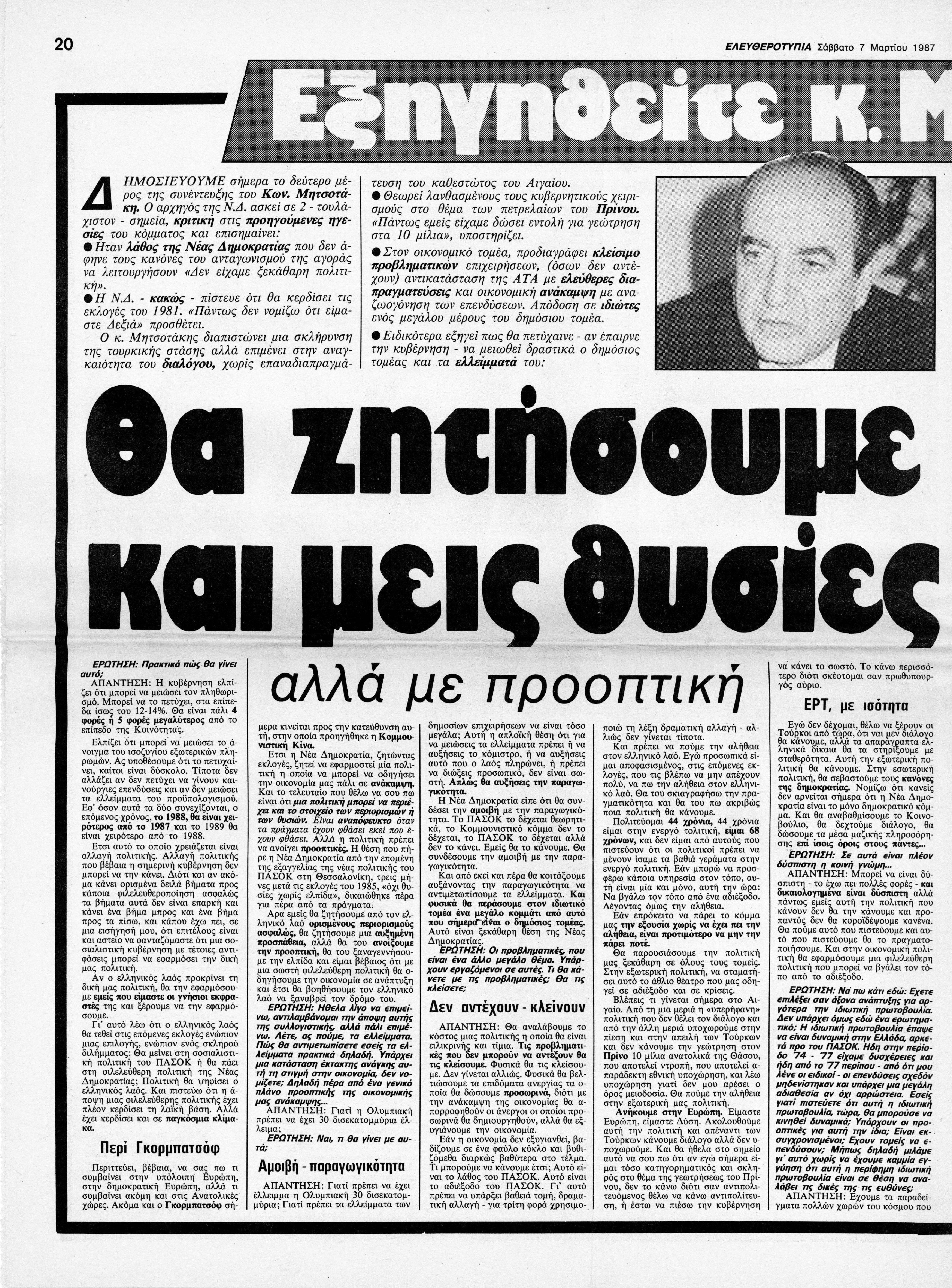 Συνέντευξη ΚΜ στην Εφημερίδα Ελευθεροτυπία σχετικά με τη θέση της ΝΔ στην εξωτερική και την οικονομική πολιτική, την κριτική στις προηγούμενες ηγεσίες της ΝΔ και στην κυβέρνηση