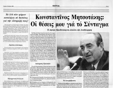 Συνέντευξη ΚΜ στην Εφημερίδα Εστία σχετικά με την αναθεώρηση του Συντάγματος και τις θέσεις του αναφορικά με τη Δικαστική Εξουσία, τον Εκλογικό Νόμο, τα ΜΜΕ και τον Κανονισμό της Βουλής