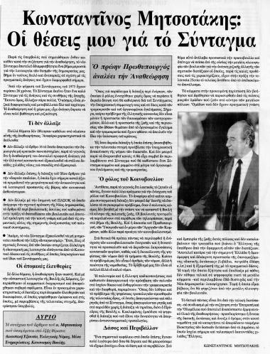Συνέντευξη ΚΜ στην Εφημερίδα Εστία σχετικά με με την αναθεώρηση του Συντάγματος και τις θέσεις του αναφορικά με τις ατομικές ελευθερίες, το δάσος και το περιβάλλον και το ρόλο του κοινοβουλίου
