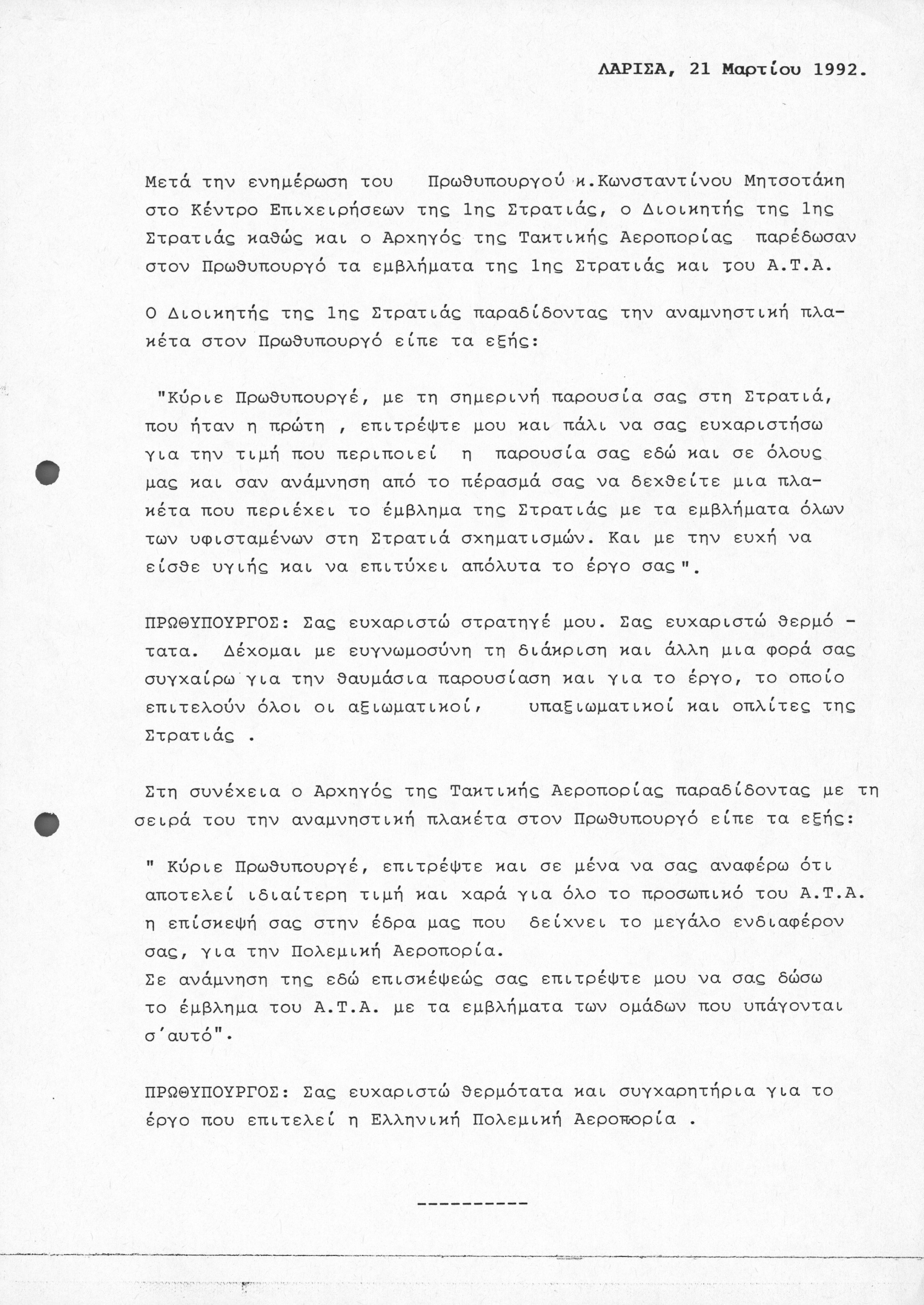 Δελτίο τύπου του Γραφείου Τύπου του Πρωθυπουργού ΚΜ σχετικά με επίσκεψη του Πρωθυπουργού ΚΜ στο Κέντρο Επιχειρήσεων της 1ης Στρατιάς στη Λάρισα