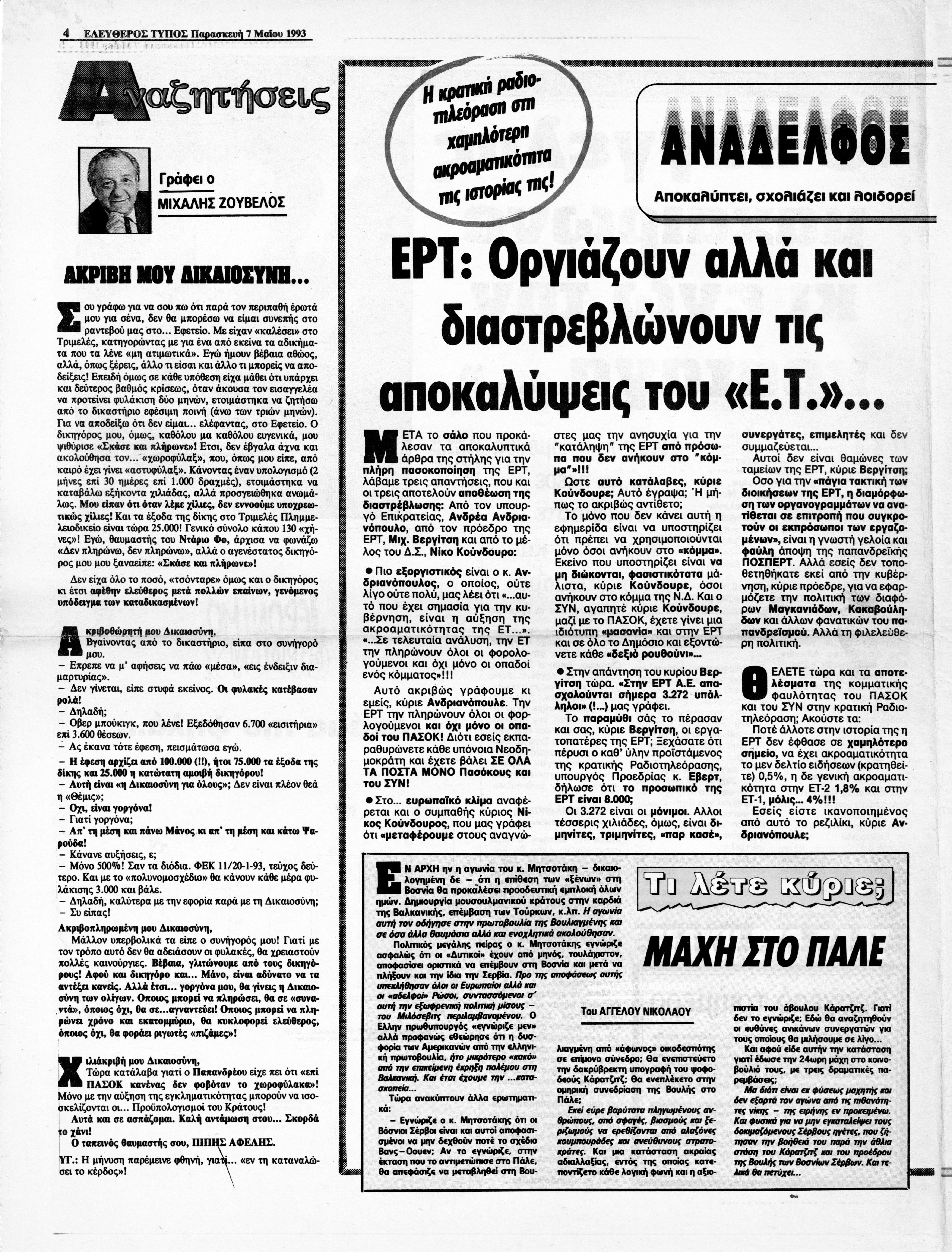 Δημοσίευμα στην Εφημερίδα Ελεύθερος Τύπος σχετικά με προσωπικό της ΕΡΤ, τον υπουργό Επικρατείας κ. Α. Ανδριανόπουλο, τον πρόεδρο της ΕΡΤ κ. Μιχ. Βεργίτση και το μέλος του Δ.Σ. κ. Νίκο Κούνδουρο