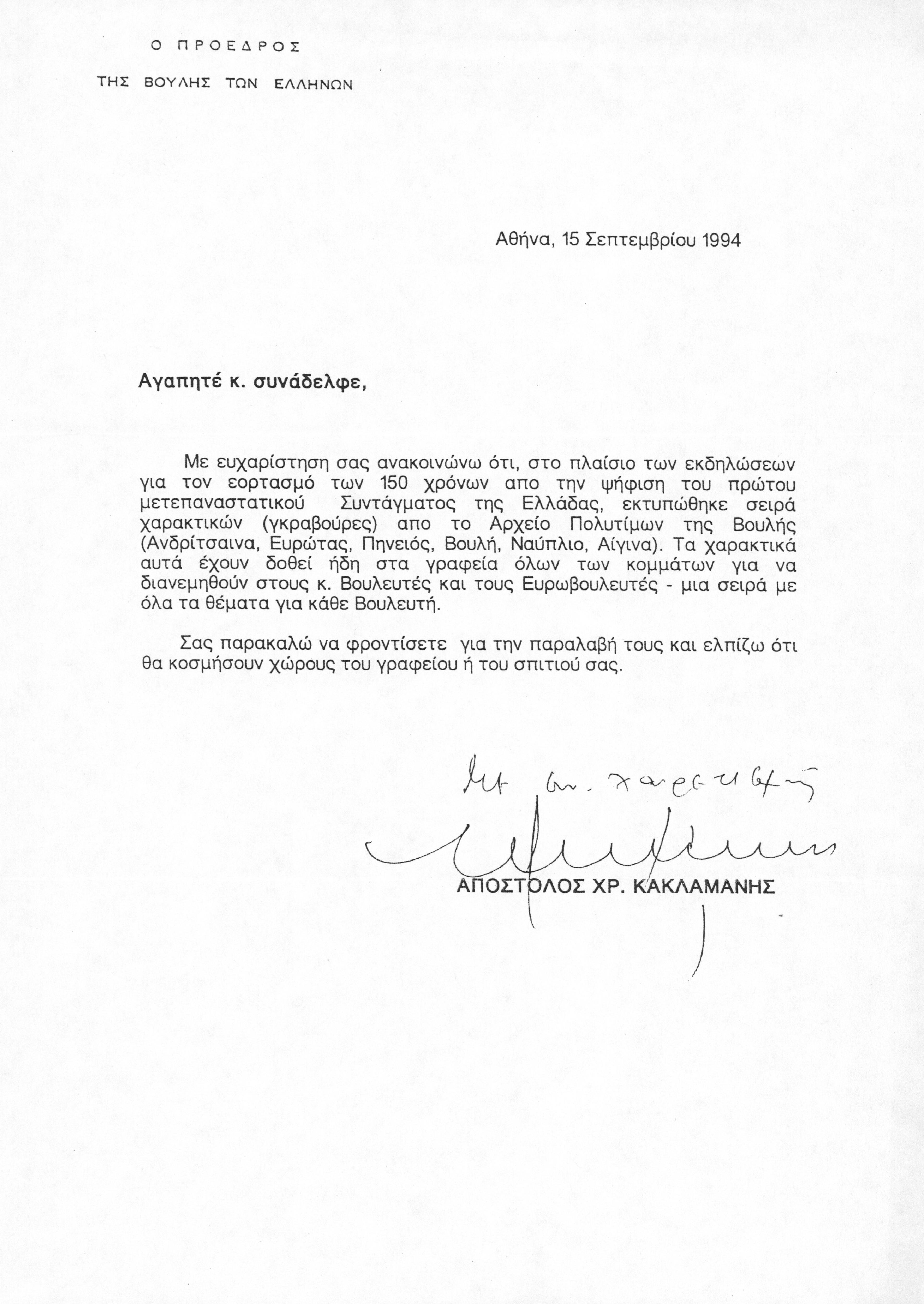 Επιστολή του Προέδρου της Βουλής κ. Απόστολου Κακλαμάνη σχετικά με τον εορτασμό των 150 χρόνων από την ψήφιση του πρώτου μετεπαναστατικού Σύντάγματος της Ελλάδας