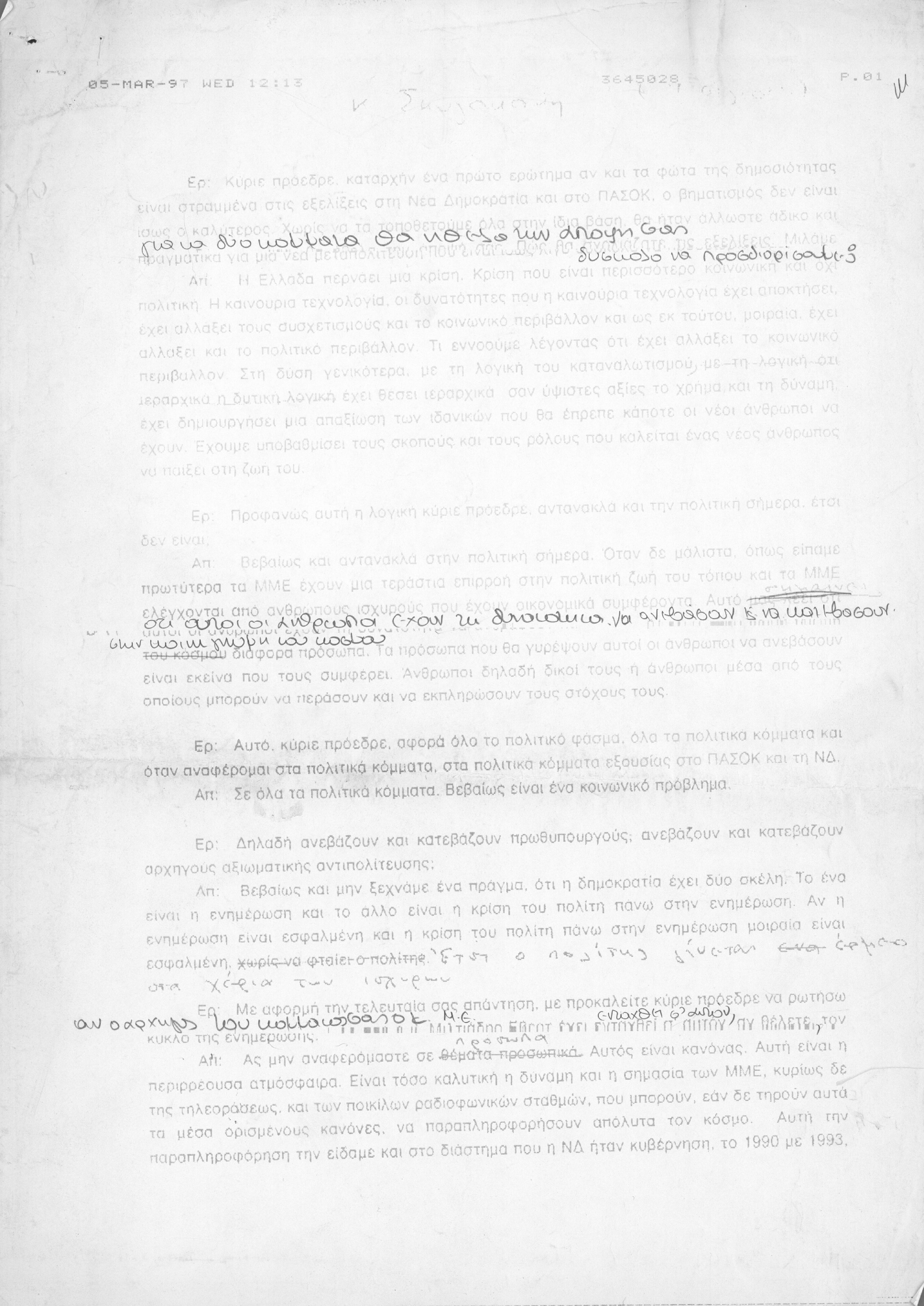 Απομαγνητοφώνηση μέρους συνέντευξης κ. Τζαννή Τζαννετάκη σχετικά με την πολιτική κατάσταση και τη ΝΔ μετά την ήττα των εκλογών του 1996