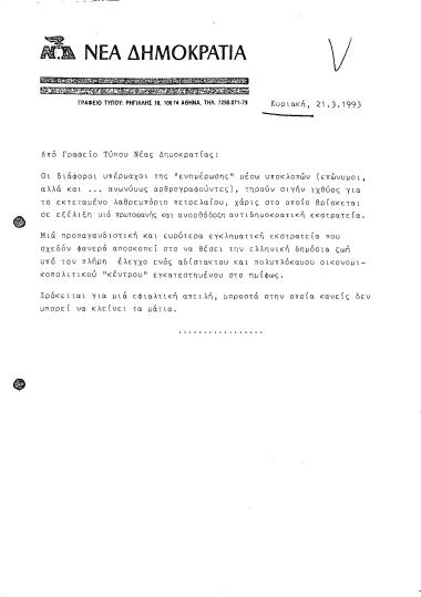 Δελτίο Τύπου από Γραφείο Τύπου ΝΔ, σχετικά με τη στάση κάποιων δημοσιογράφων απέναντι στο θέμα Αλαφούζου
