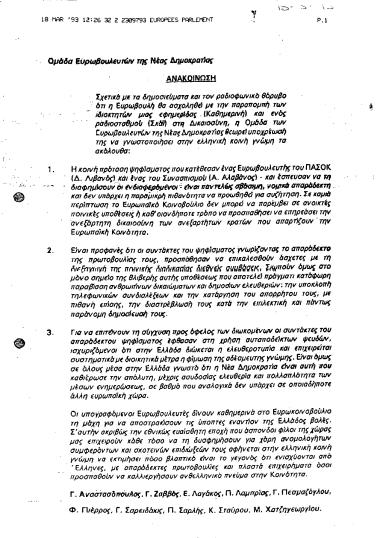 Ανακοίνωση ευρωβουλευτών της ΝΔ, με την οποία αποκλείουν το ενδεχόμενο να ασχοληθεί η Ευρωβουλή με το ζήτημα της παραπομπής Αλαφούζου στη Δικαιοσύνη