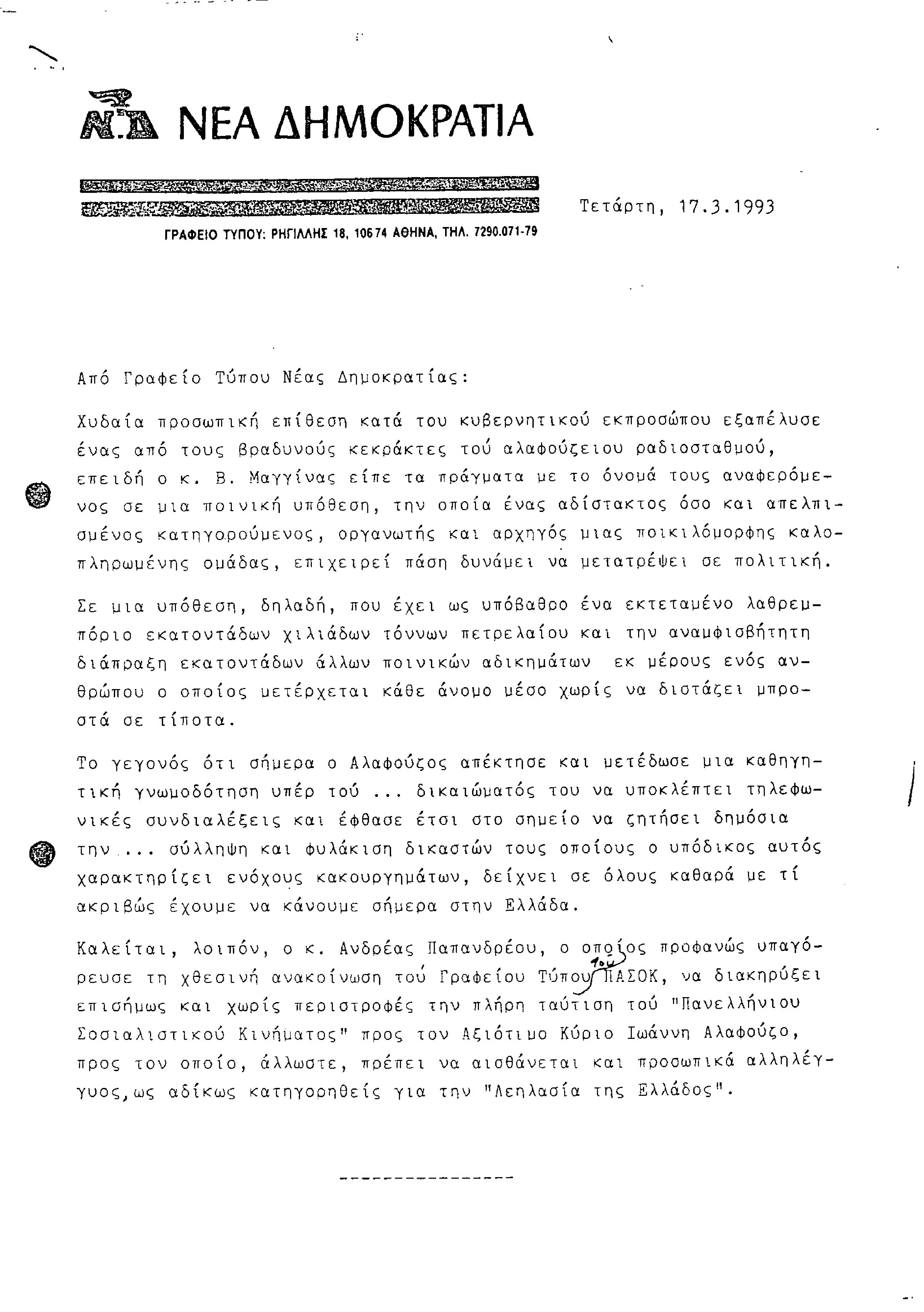 Δελτίο Τύπου από Γραφείο Τύπου ΝΔ, σχετικά με επίθεση Ρ/Σ SKY κατά του κυβερνητικού εκπροσώπου, μετά από δηλώσεις του τελευταίου για την υπόθεση Αλαφούζου