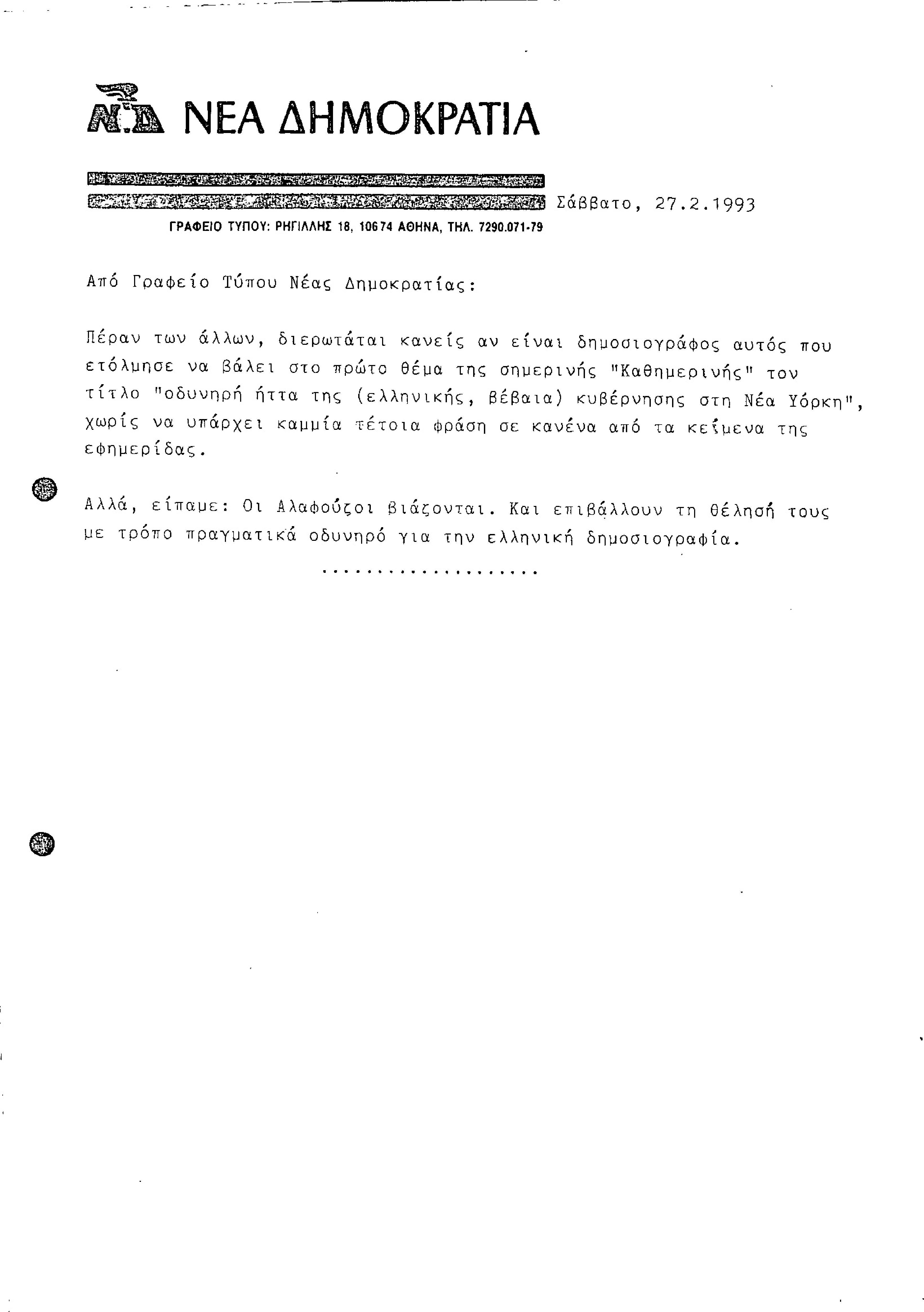 Δελτίο Τύπου από Γραφείο Τύπου ΝΔ, σχετικά με δημοσίευμα εφημερίδας Καθημερινή