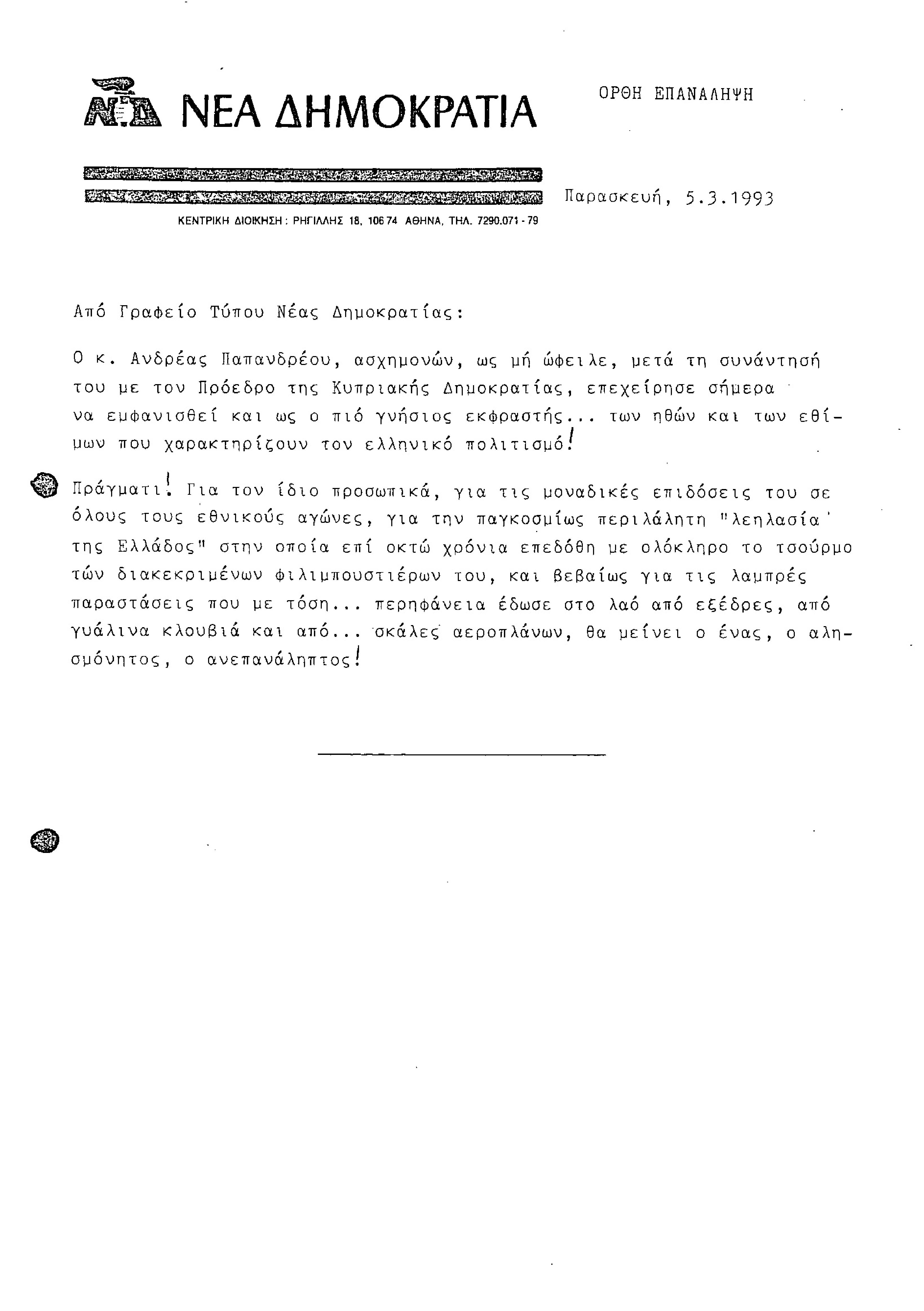 Δελτίο Τύπου από Γραφείο Τύπου ΝΔ, σχετικά με τις δηλώσεις Α. Παπανδρέου μετά από συνάντησή του με τον Πρόεδρο της Κυπριακής Δημοκρατίας