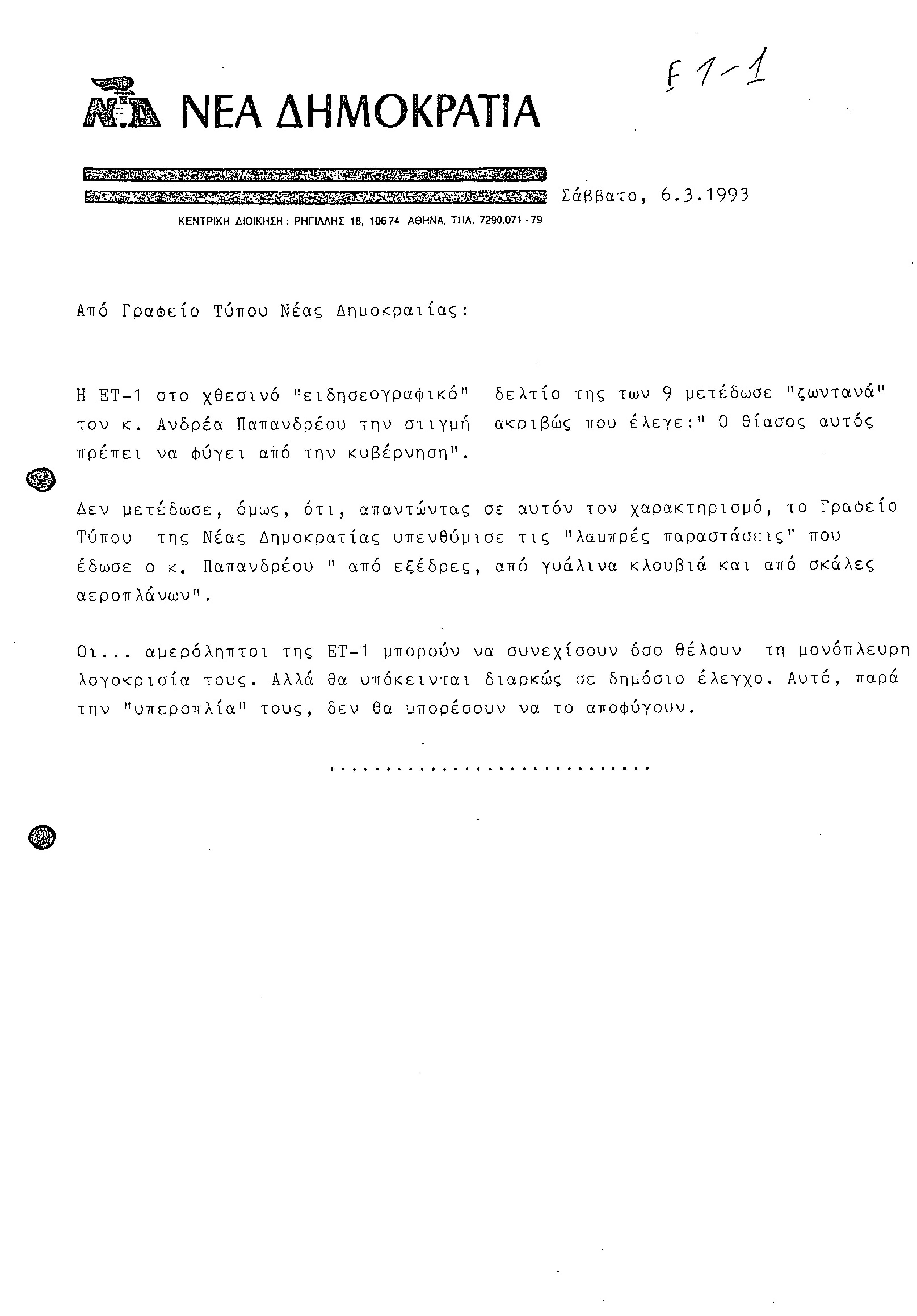 Δελτίο Τύπου από Γραφείο Τύπου ΝΔ, σχετικά με δελτίο ειδήσεων της ΕΤ-1