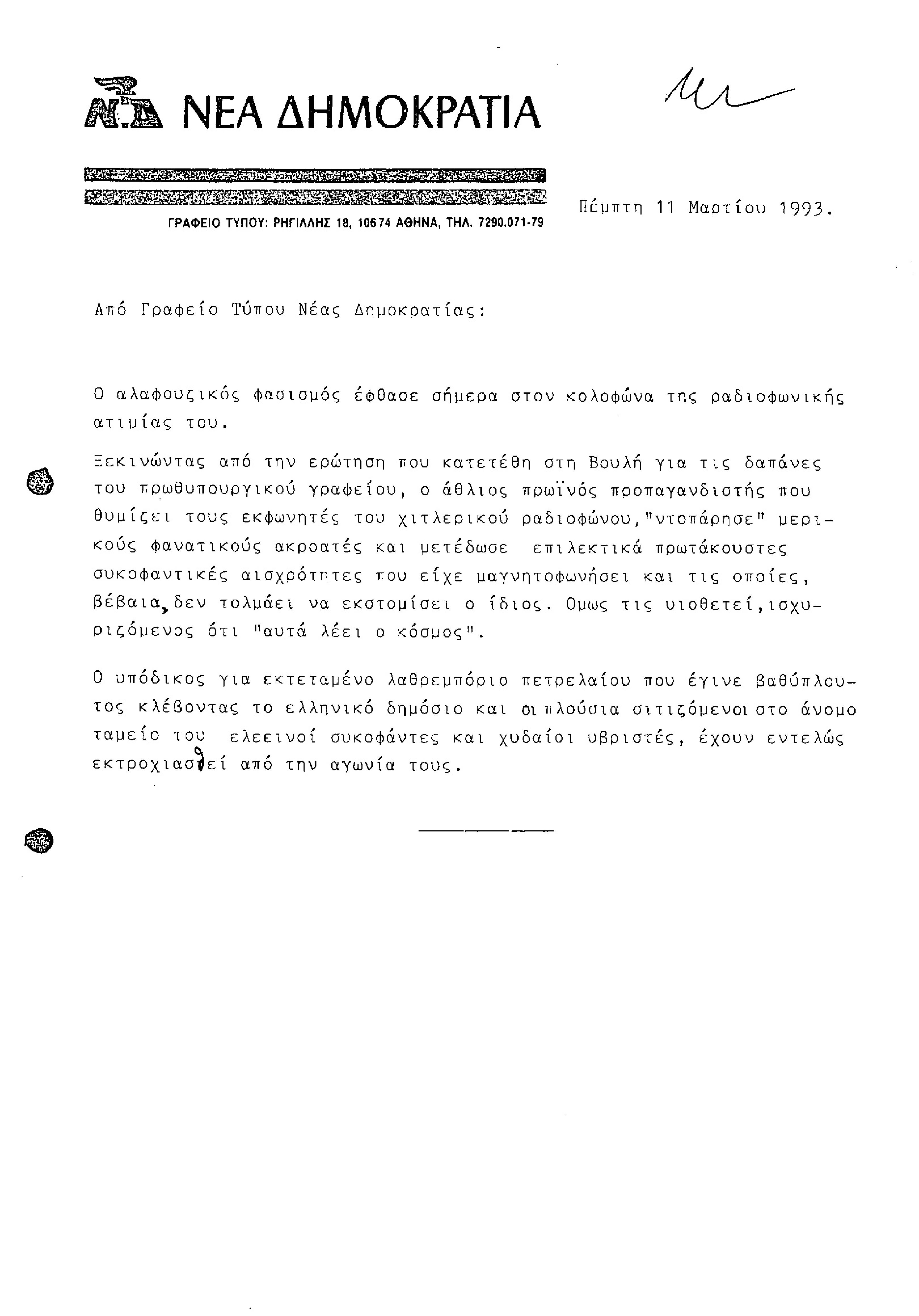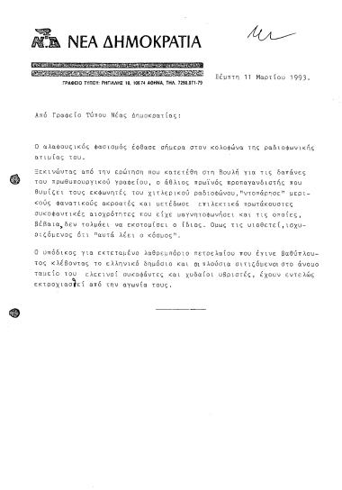 Δελτίο Τύπου από Γραφείο Τύπου ΝΔ, σχετικά με τον Αλαφούζο και τα μεταδιδόμενα από τον Ρ/Σ SKY
