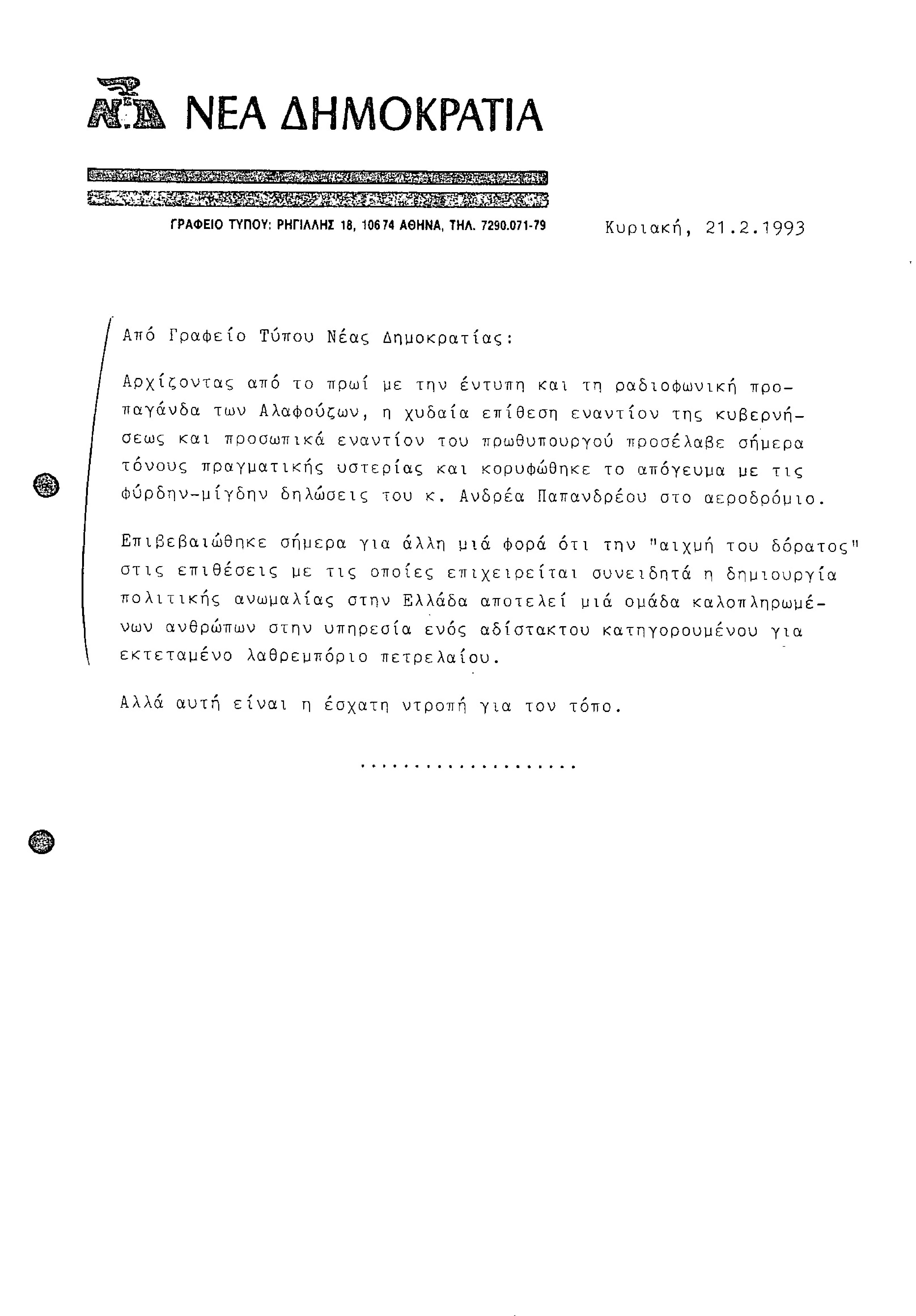 Δελτίο Τύπου από Γραφείο Τύπου ΝΔ, σχετικά με εκπομπές Ρ/Σ SKY, δημοσιεύματα εφημερίδας Καθημερινή και δηλώσεις του Α. Παπανδρέου