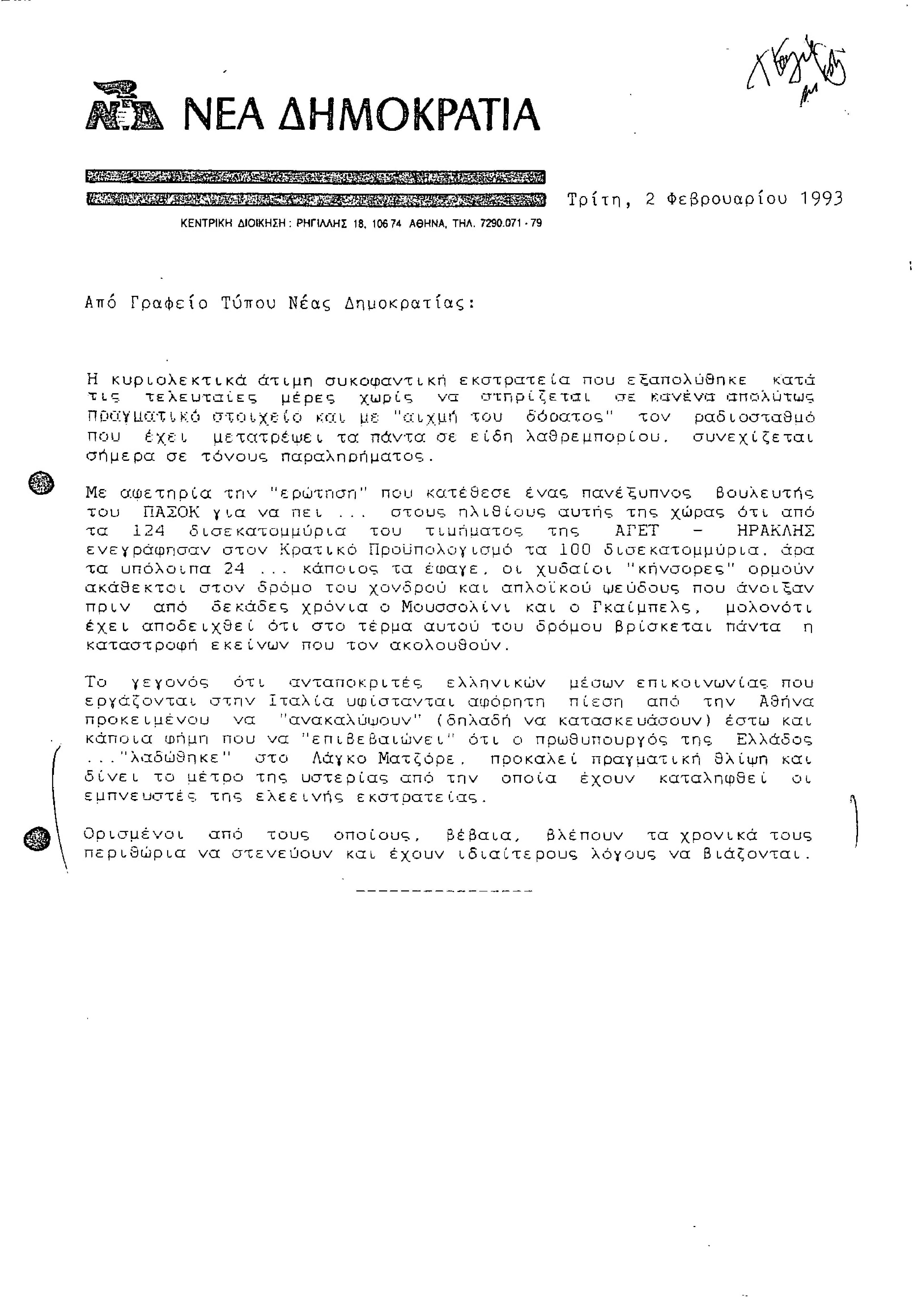 Δελτίο Τύπου από Γραφείο Τύπου ΝΔ, σχετικά με εκτεταμένες προσπάθειες παραπληροφόρηση στο ζήτημα πώλησης της ΑΓΕΤ-ΗΡΑΚΛΗΣ