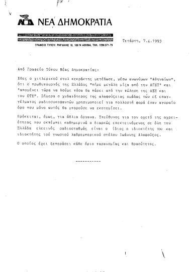 Δελτίο Τύπου από Γραφείο Τύπου ΝΔ, σχετικά με τον Αλαφούζο και τα μεταδιδόμενα από τον Ρ/Σ SKY