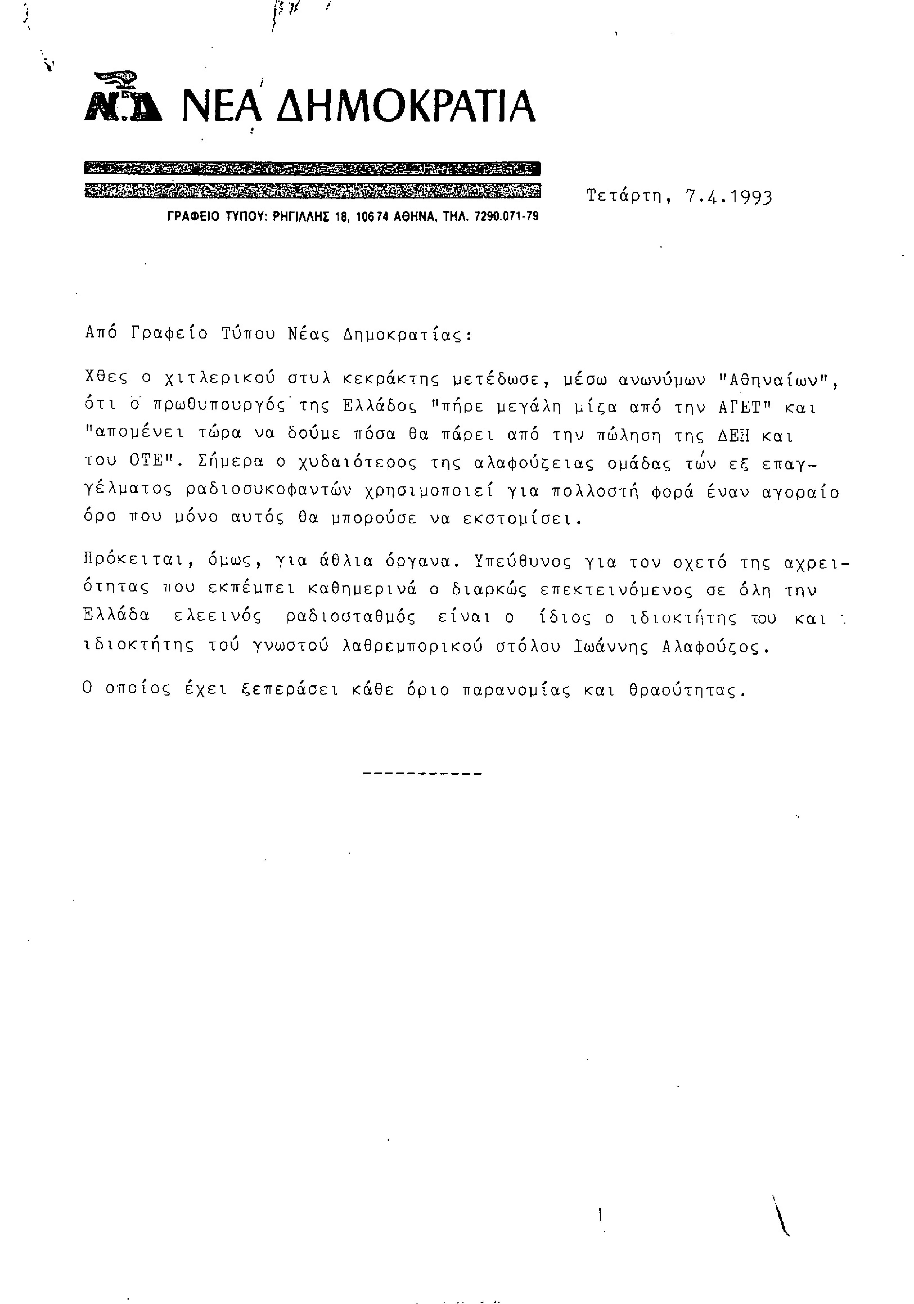 Δελτίο Τύπου από Γραφείο Τύπου ΝΔ, σχετικά με τον Αλαφούζο και τα μεταδιδόμενα από τον Ρ/Σ SKY