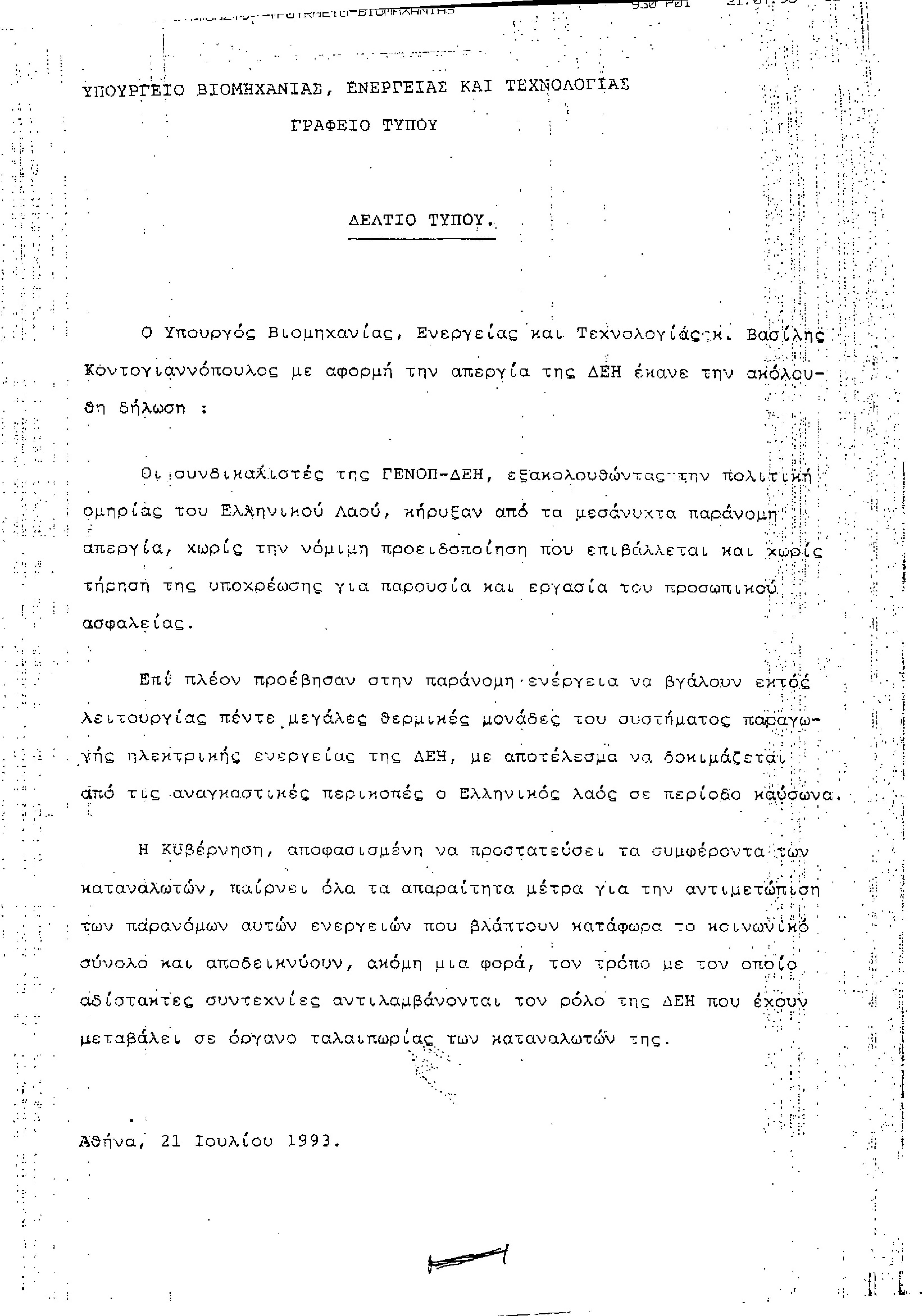 Δελτίο Τύπου από Γραφείο Τύπου Υπουργείου Βιομηχανίας, Ενέργειας και Τεχνολογίας, σχετικά με απεργία ΔΕΗ