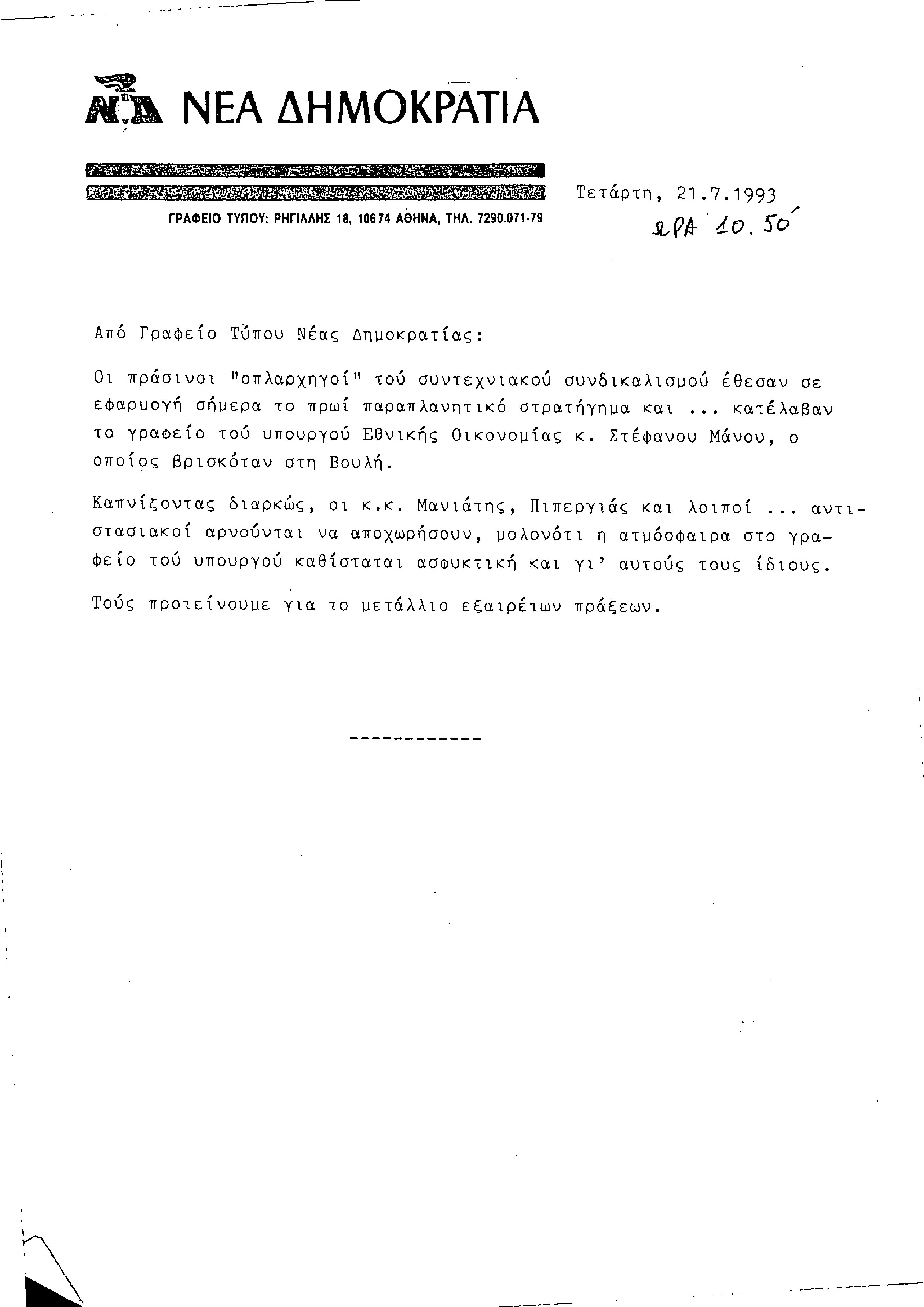 Δελτίο Τύπου από Γραφείο Τύπου ΝΔ, σχετικά με την κατάληψη του γραφείου του υπουργού από συνδικαλιστές