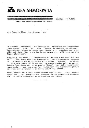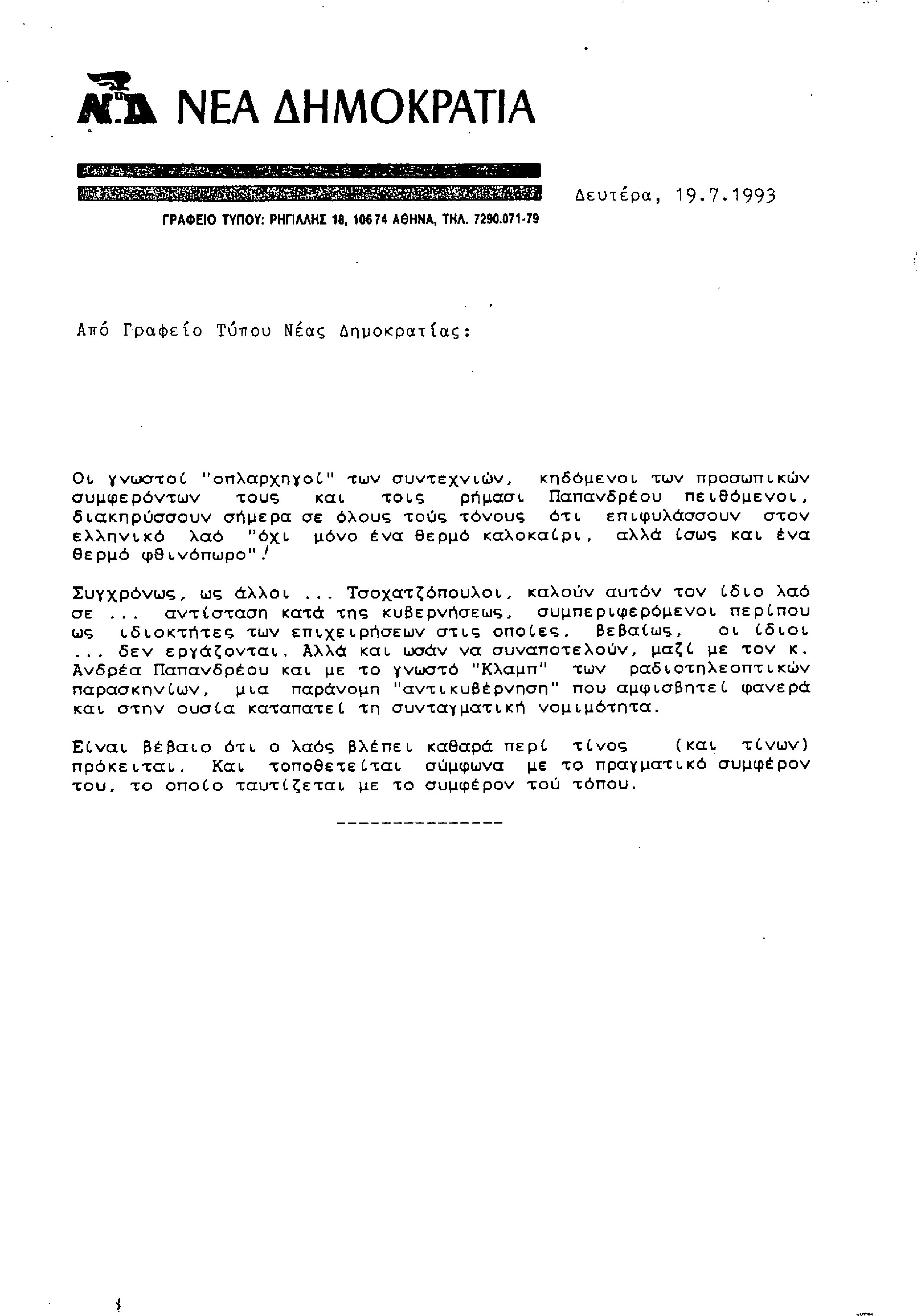 Δελτίο Τύπου από Γραφείο Τύπου ΝΔ, σχετικά με τις αντιδράσεις συνδικαλιστών στο κυβερνητικό πρόγραμμα αποκρατικοποιήσεων