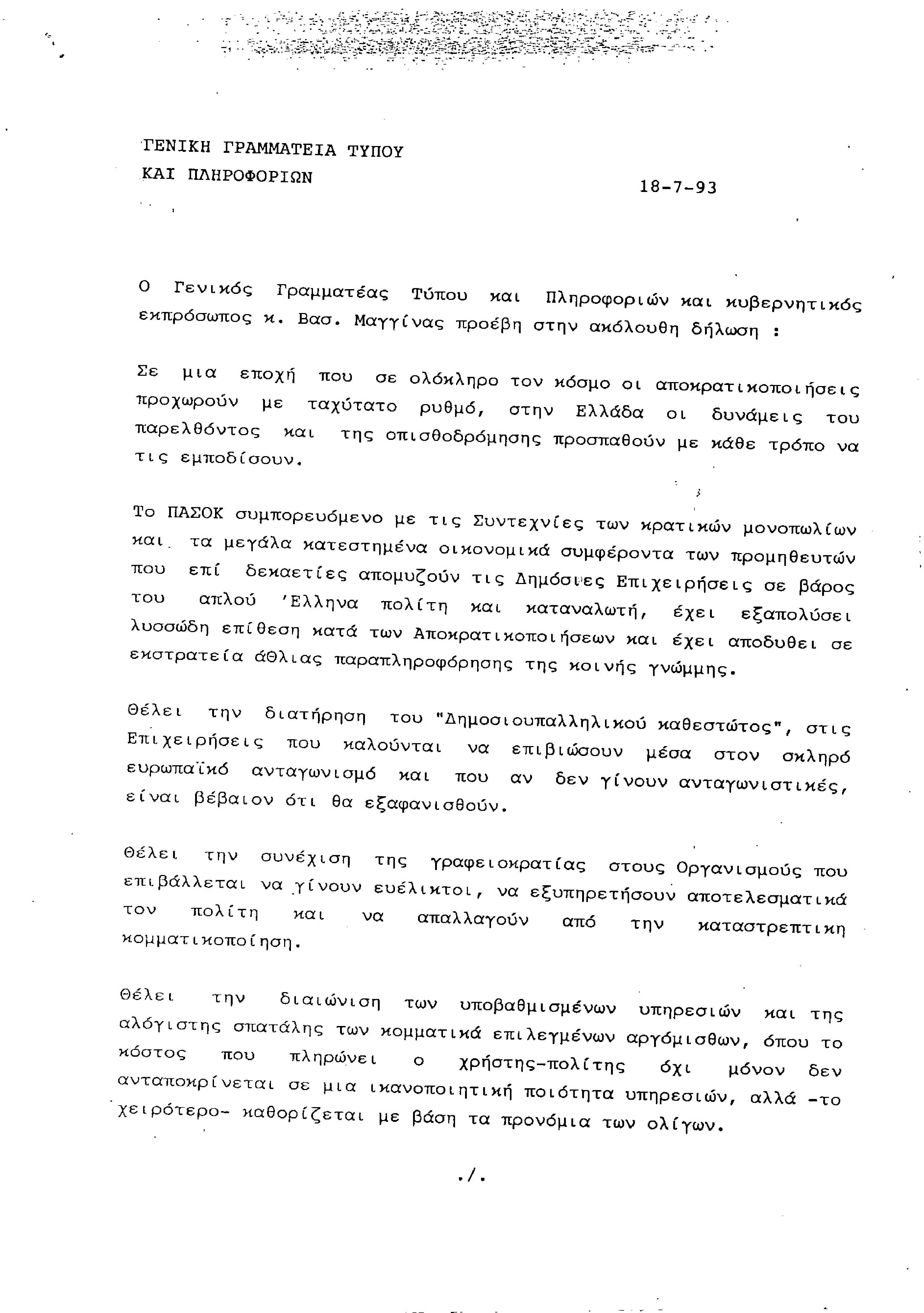 Δελτίο Τύπου της ΓΓΤΠ με δήλωση του ΓΓΤΠ και κυβερνητικού εκπροσώπου Βασίλη Μαγγίνα σχετικά με τις αποκρατικοποιήσεις και την αντιπολιτευτική τακτική του ΠΑΣΟΚ