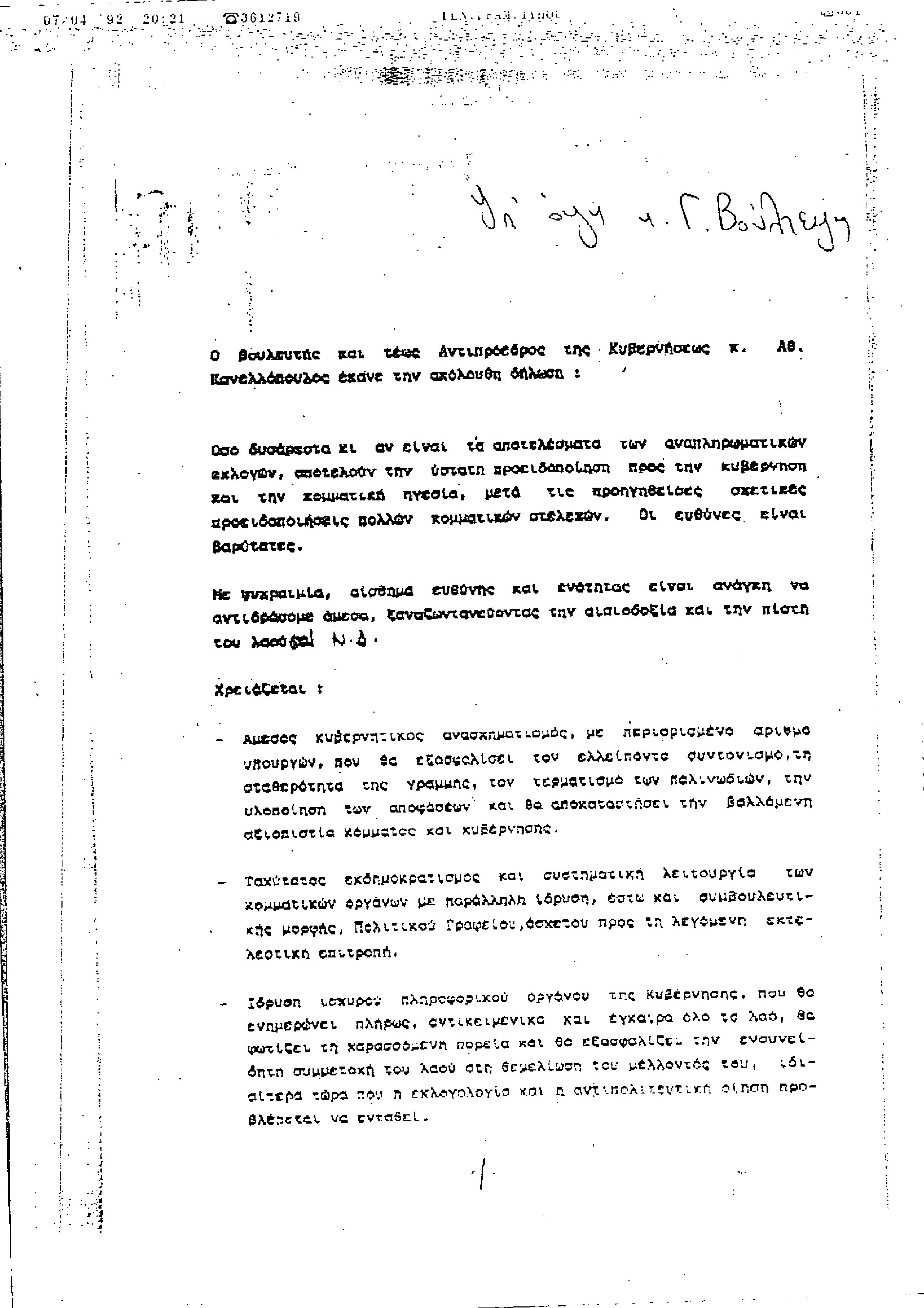 Δήλωση Αθαν. Κανελλόπουλου μετά από αναπληρωματικές εκλογές 05/04/1992, με προτάσεις για βελτίωση της κυβερνητικής και της κομματικής λειτουργίας ΝΔ