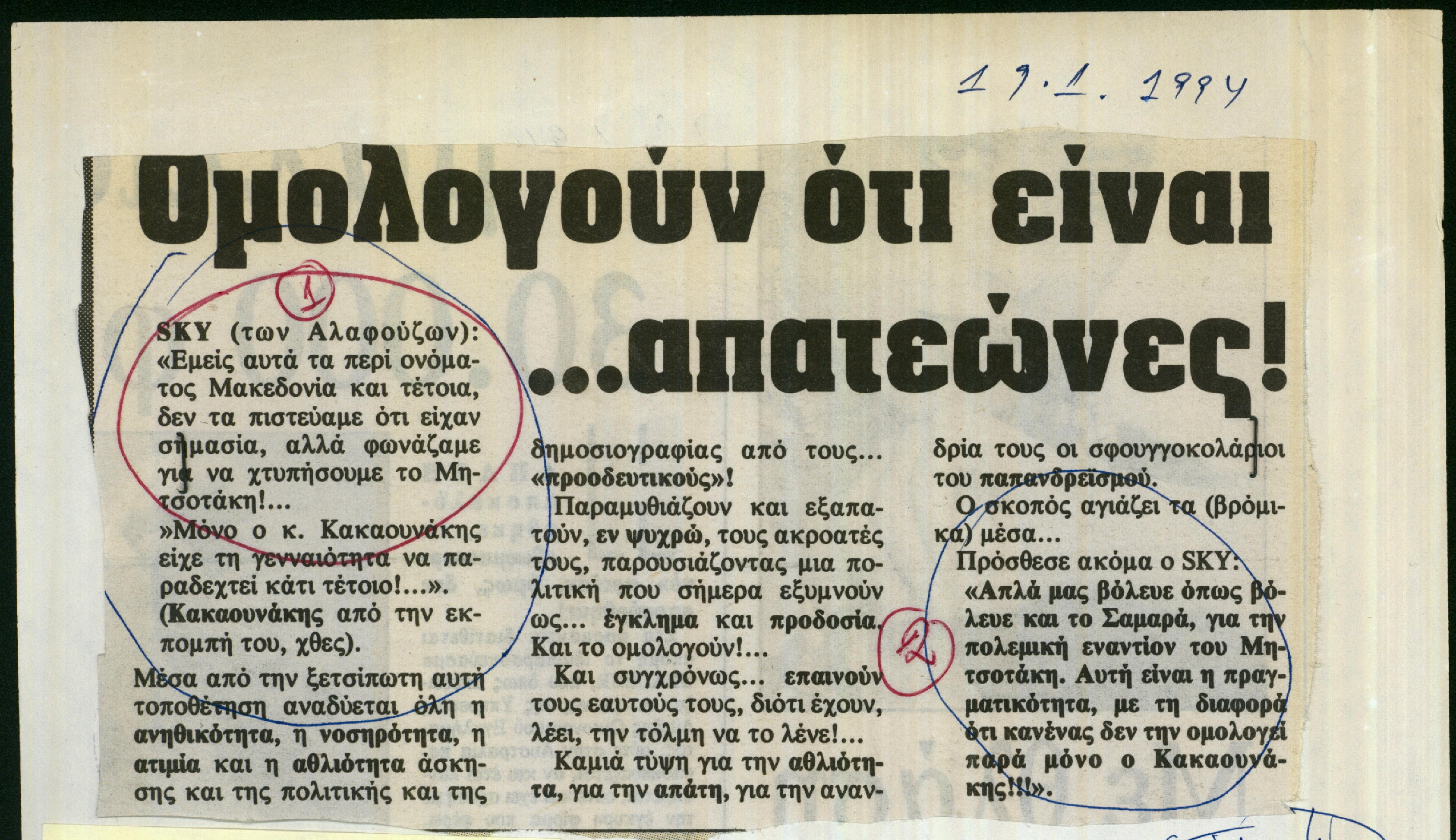 Δημοσίευμα εφημερίδας Ελεύθερος Τύπος, σχετικά με αποκαλύψεις Νίκου Κακαουνάκη για τη στάση του Ρ/Σ SKY στο ζήτημα των Σκοπίων