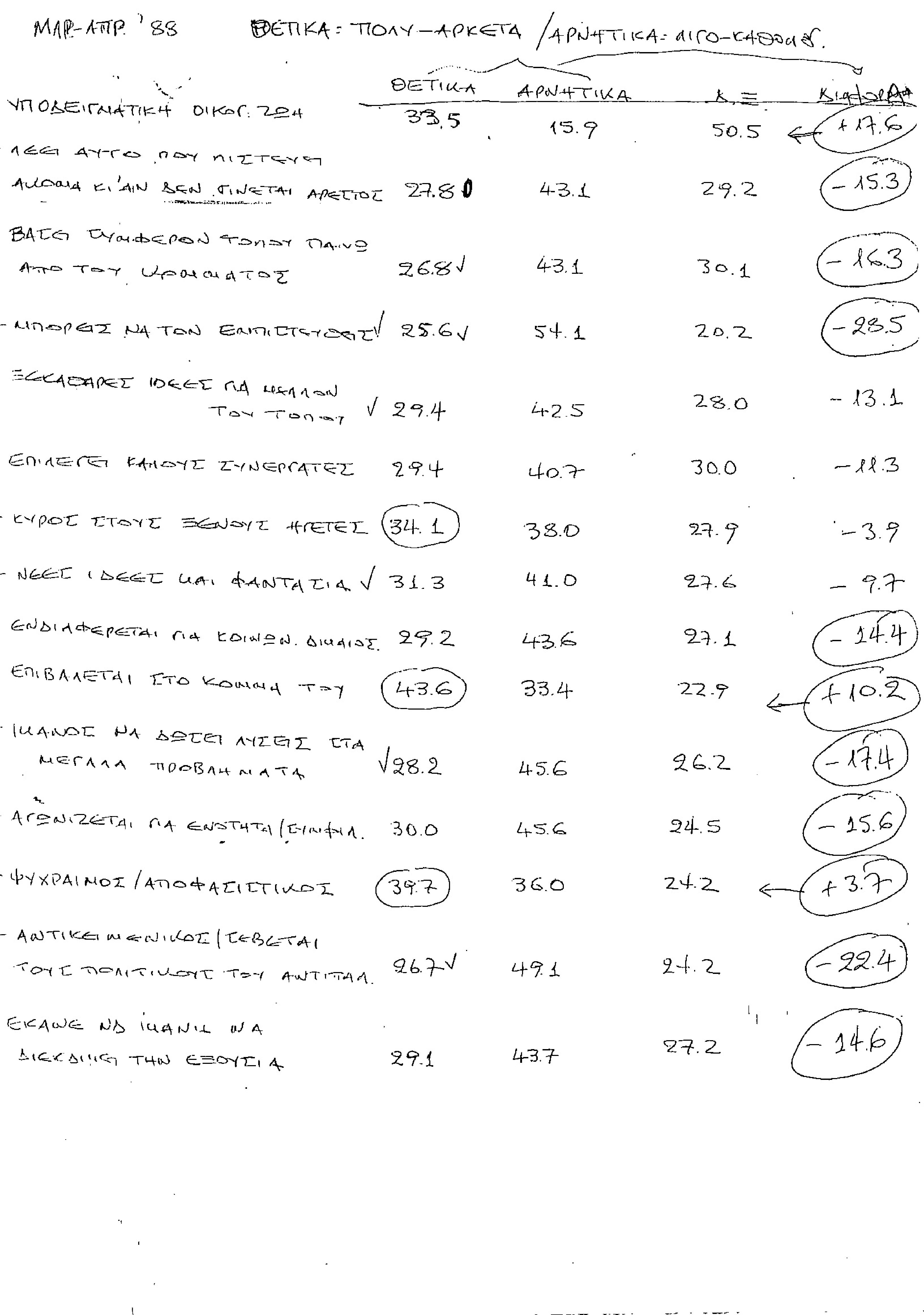 Χειρόγραφο απόσπασμα αποτελεσμάτων έρευνας κοινής γνώμης, αγνώστων λοιπών στοιχείων -- Μάρτιος - Απρίλιος 1988