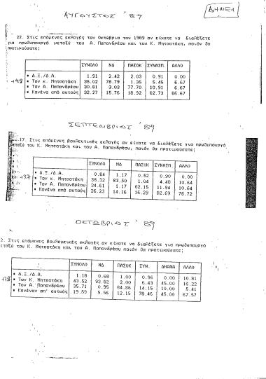 Από εταιρεία ΔΗΜΕΛ, απόσπασμα αποτελεσμάτων έρευνας κοινής γνώμης -- Αύγουστος - Οκτώβριος 1989