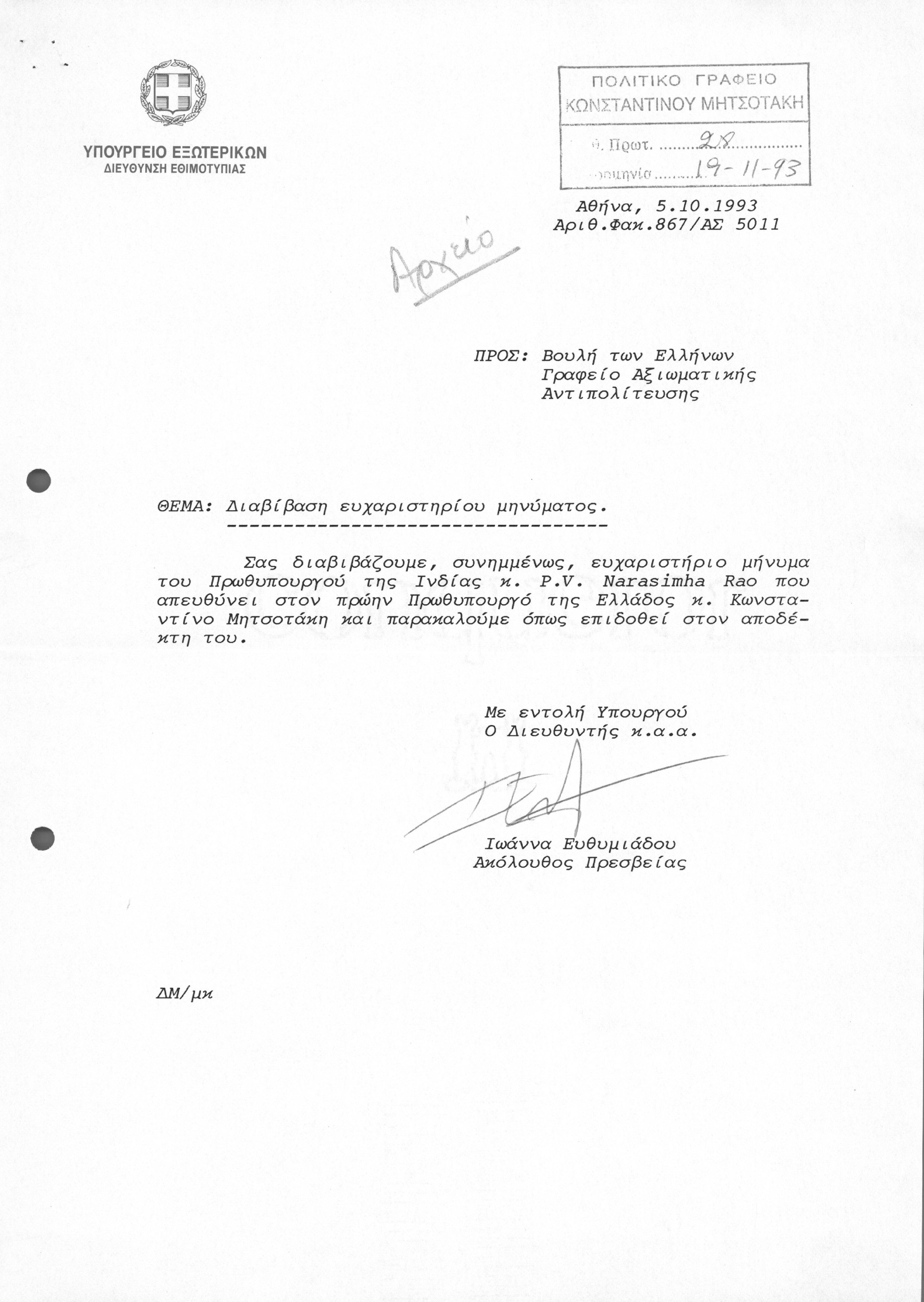 Επιστολή από πρωθυπουργό Ινδίας προς ΚΜ, με την οποία τον ευχαριστεί για την ελληνική συμπαράσταση μετά τον σεισμό που έπληξε την Ινδία