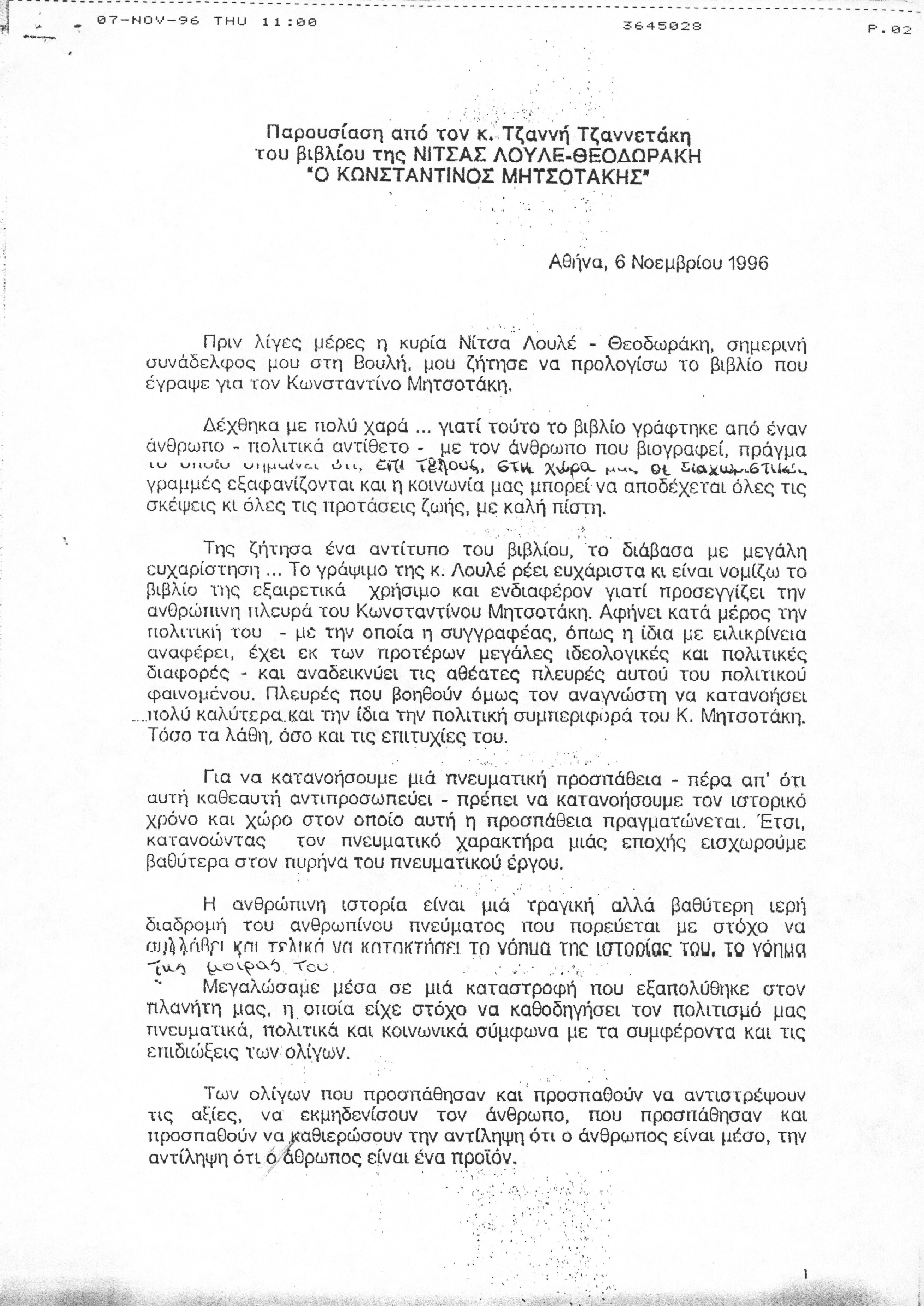 Κείμενο ομιλίας του Τζαννή Τζαννετάκη στην εκδήλωση για την παρουσίαση του βιβλίου της Νίτσας Λουλέ Κωνσταντίνος Μητσοτάκης
