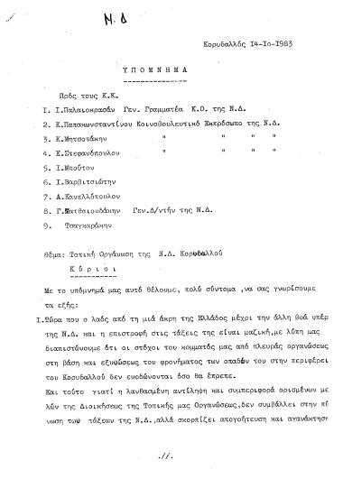 Από Τοπική Οργάνωση ΝΔ Κορυδαλλού, υπόμνημα προς ανώτατα όργανα και στελέχη της ΝΔ με προτάσεις για τη βελτίωση της κομματικής λειτουργίας