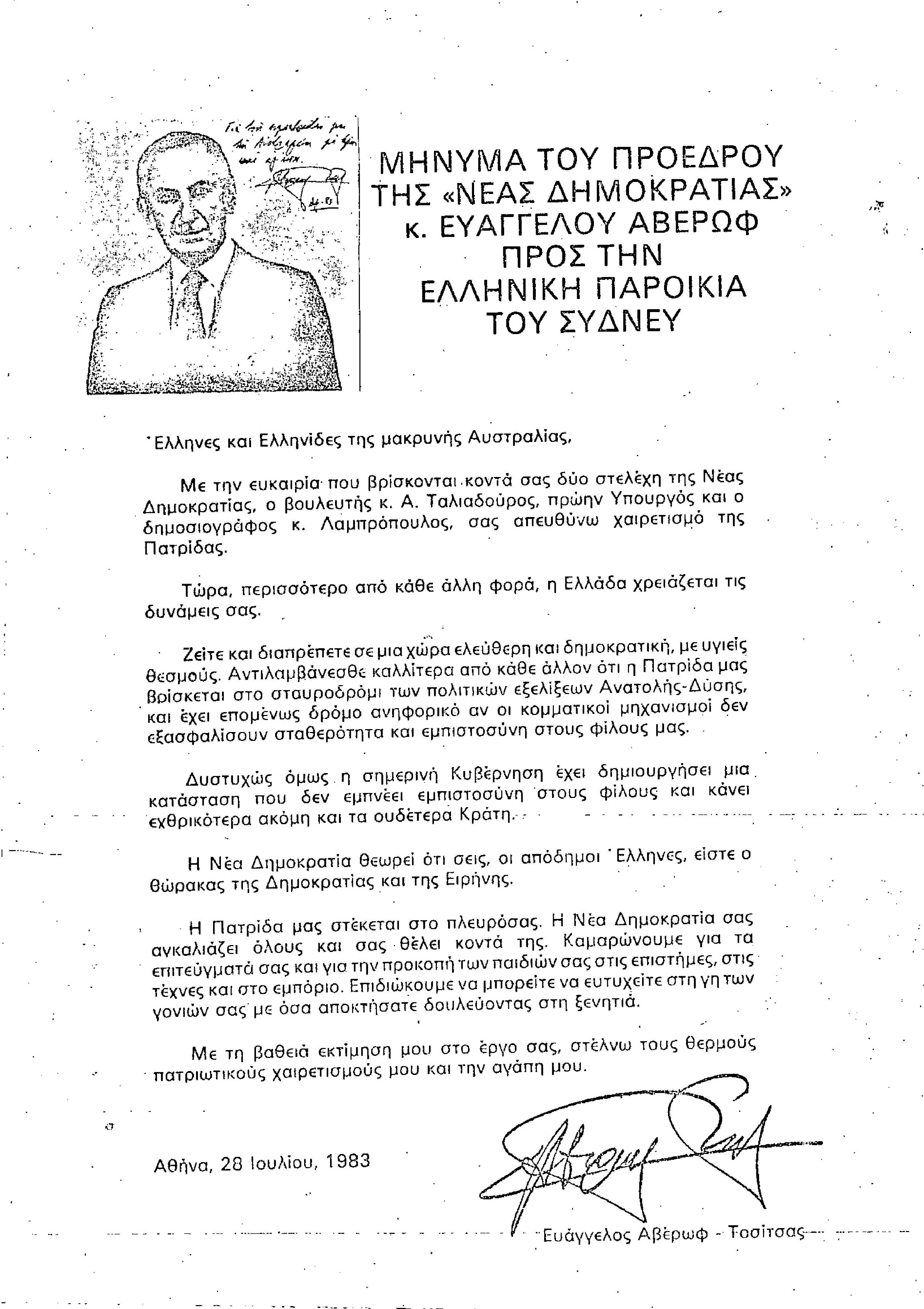 Μήνυμα του προέδρου της ΝΔ κ. Ευάγγελου Αβέρωφ προς την ελληνική παροικία του Σύδνεϋ