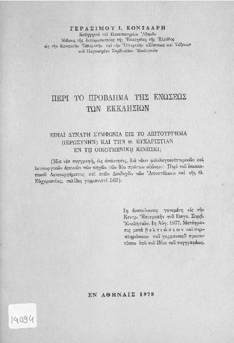 Περί το πρόβλημα της Ενώσεως των Εκκλησιών: είναι δυνατή συμφωνία εις το λειτούργημα (Ιερωσύνην) και την Θ. Ευχαριστίαν εν τη Οικουμενική Κινήσει;
