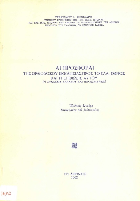 Αι προσφοραί της Ορθοδόξου Εκκλησίας προς το ελλ. έθνος και η επιβίωσις αυτού (η σύνδεσις Ελλάδος και Ιεροσολύμων)