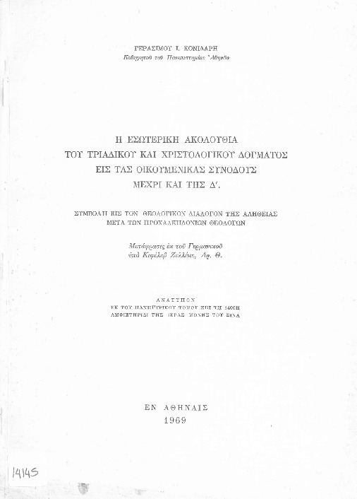 Η εσωτερική ακολουθία του τριαδικού και χριστολογικού δόγματος εις τας οικουμενικάς συνόδους μέχρι και της Δ' : συμβολή εις τον θεολογικόν διάλογον της αλήθειας μετά των προχαλκηδονίων θεολόγων