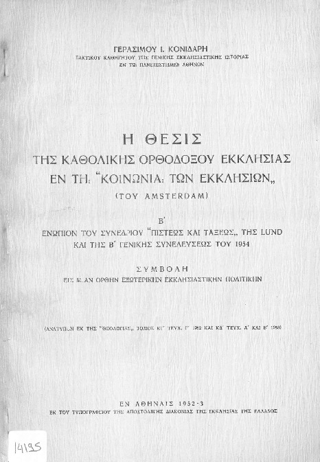 Η θέσις της καθολικής ορθοδόξου εκκλησίας εν τη "Κοινωνία των Εκκλησιών" (του Amsterdam τ.Β ενώπιον του Συνεδρίου "Πίστεως και τάξεως" της Lund και της Β' γενικής Συνελεύσεως του 1954: συμβολή εις μίαν ορθήν εξωτερικήν εκκλησιαστικήν πολιτικήν
